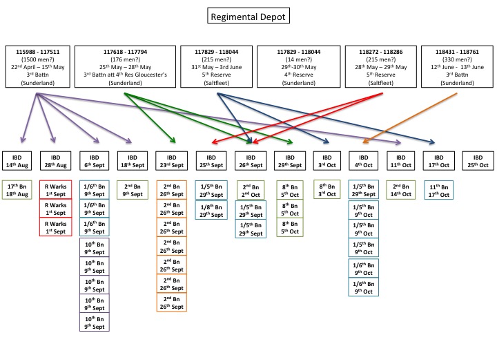 Quite interesting really. The 3rd and 4th Reserve Battalions in the Northeast and the 5th Reserve in Saltfleet appear to have undertaken most of the training and men were then posted onto just several different Battalions via the Infantry Base Depots.