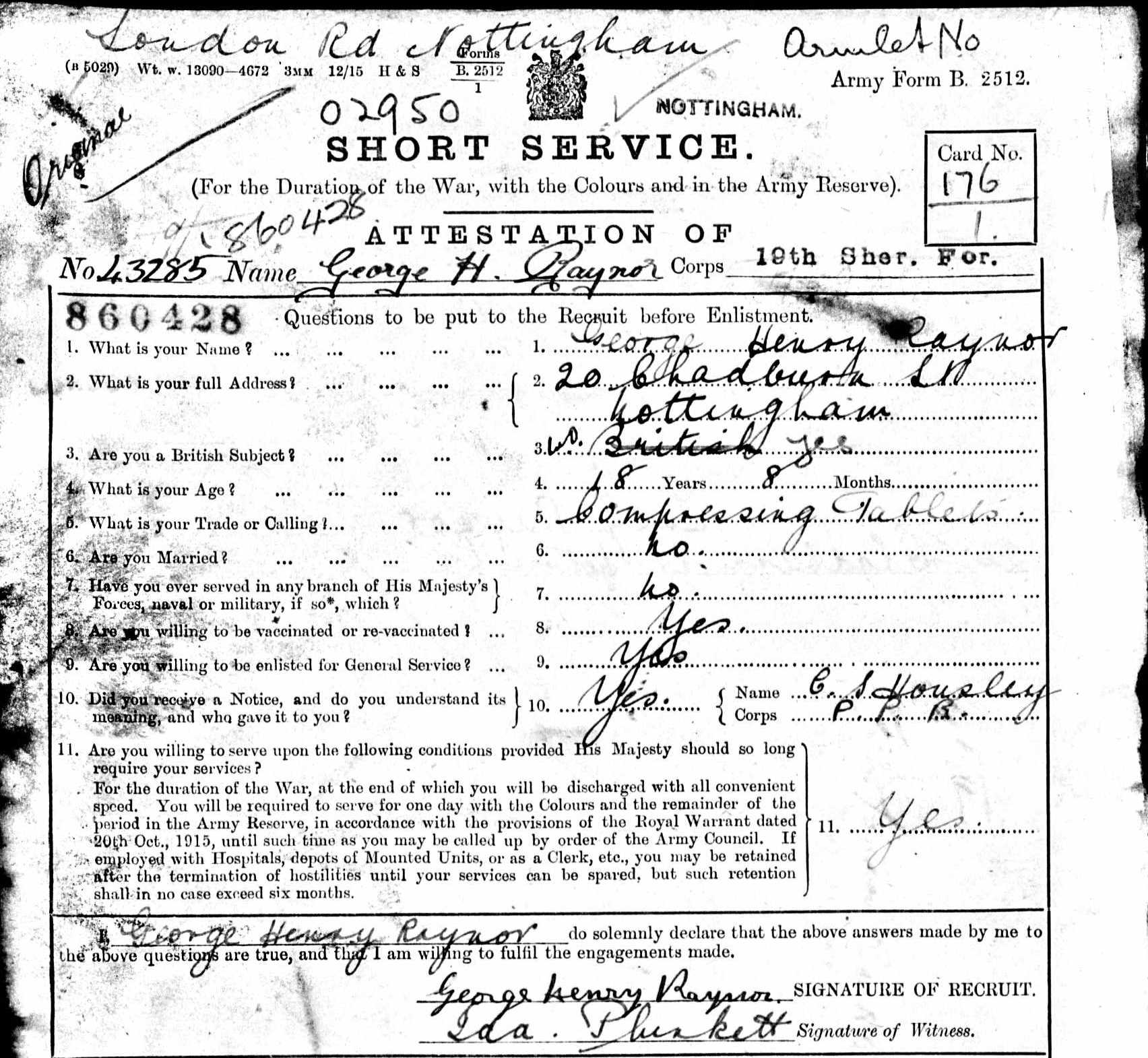 An interesting (and rare) find on Ancestry yesterday; the Attestation of George Henry Raynor from Nottingham into the 19th Battalion Sherwood Foresters.