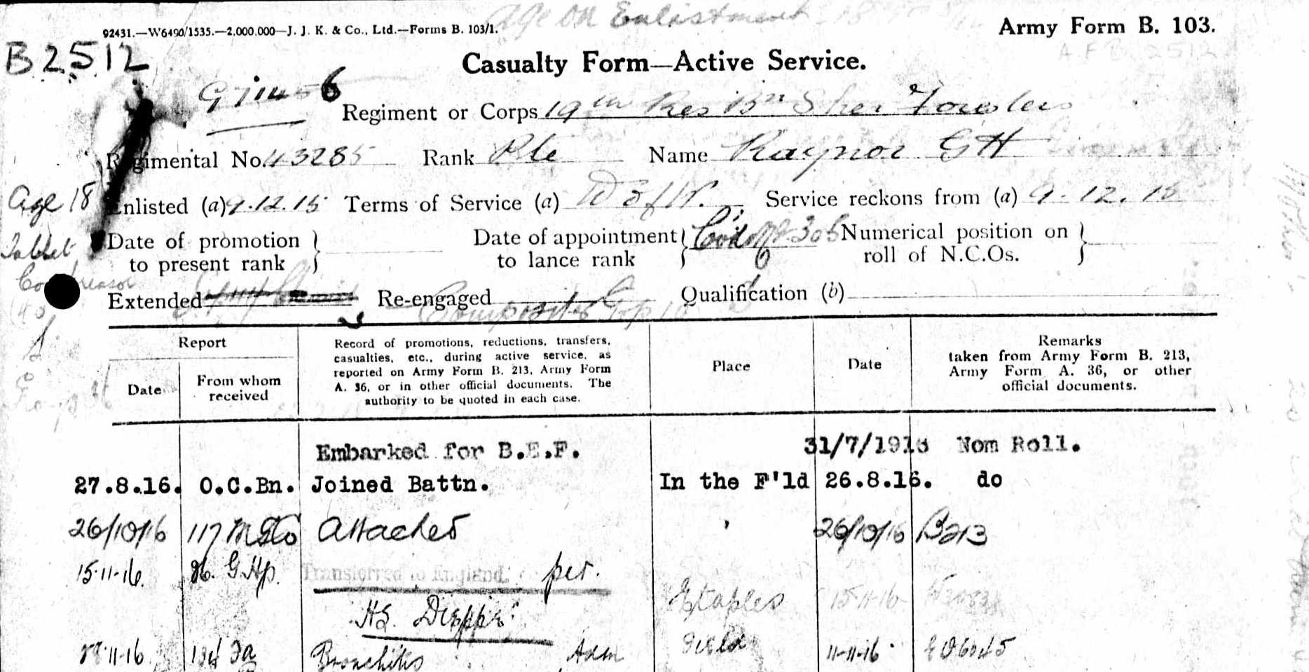 George originally attested in December 1915, most likely as part of the ‘Derby Scheme’. He was mobilised on the 15th April 1916 and on the following day was posted to the 19th Sherwood Foresters at that time stationed at Ripon. Following basic Infantry train George was transferred to the 17th Battalion and embarked for France on the 31st July 1916.