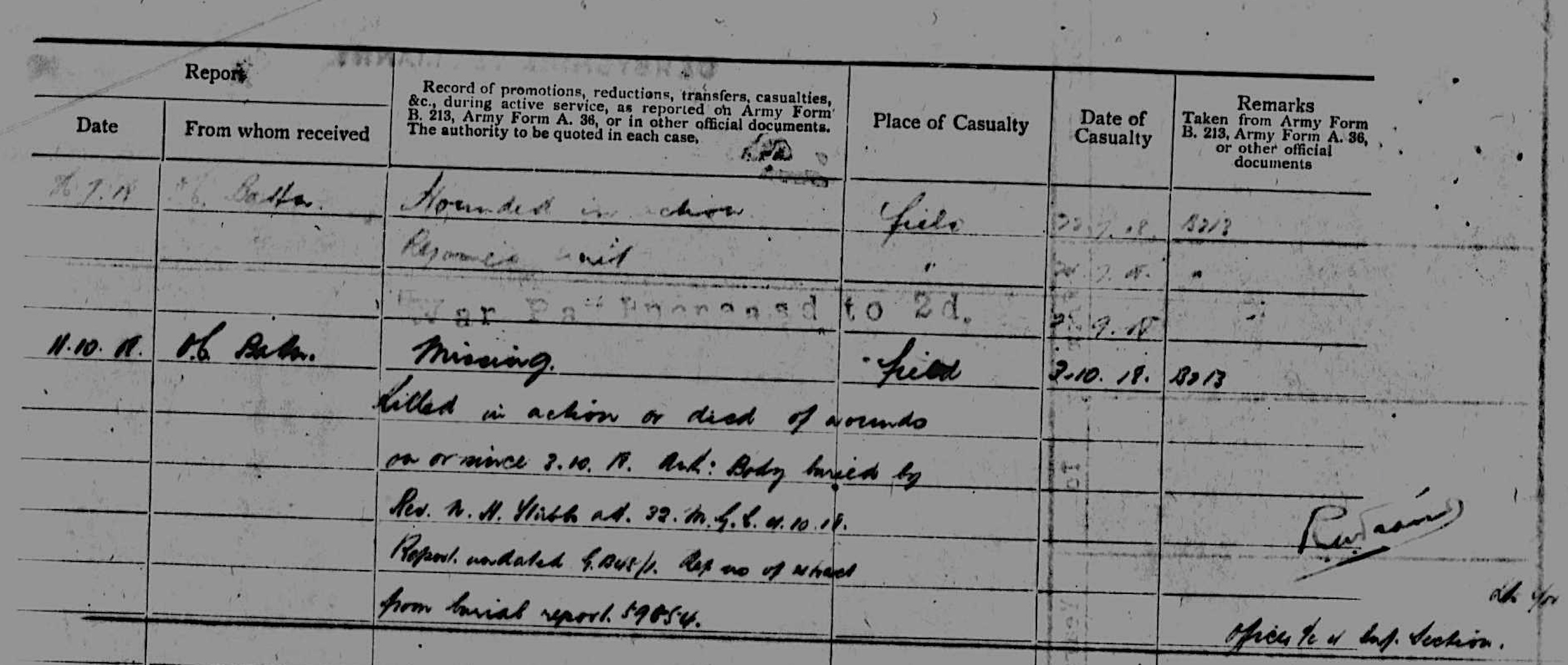 “Killed in action or died of wounds on or since 3.10.18. Body buried by Rev M H ?? and 32 MGC 11.10.18”