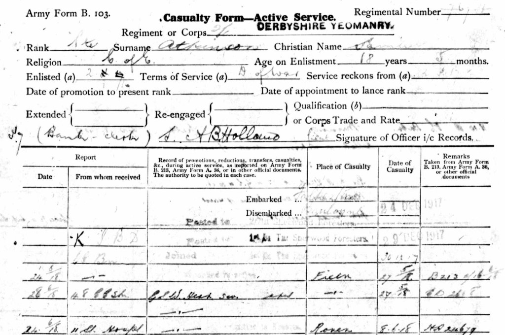 Following basic training Samuel embarked from Folkestone on Christmas Eve 1917 and going ‘K’ Infantry Base Depot, where he was transferred to the 2/7th Battalion Sherwood Foresters (for record purposes). Samuel was amongst a number of soldiers who at that time were transferred to the Sherwood Foresters from the Derbyshire Yeomanry and Nottinghamshire Yeomanry (Sherwood Rangers).