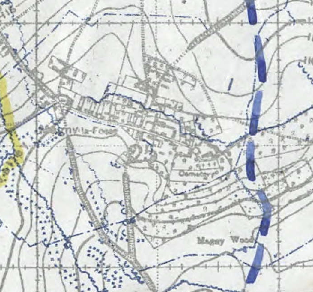MAGNY-LA-FOSSE CHURCHYARD EXTENSION was made by an Advanced Dressing Station in October 1918, and contained the graves of seven soldiers from the United Kingdom and one from Australia and three men of the Chinese Labour Corps.