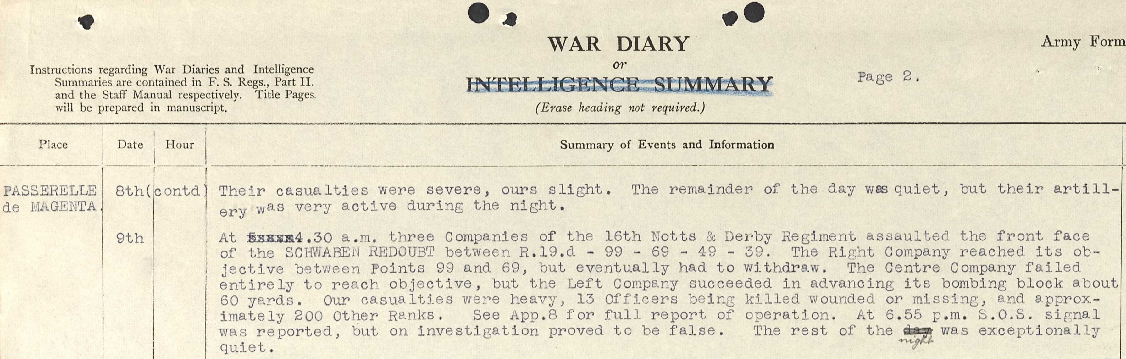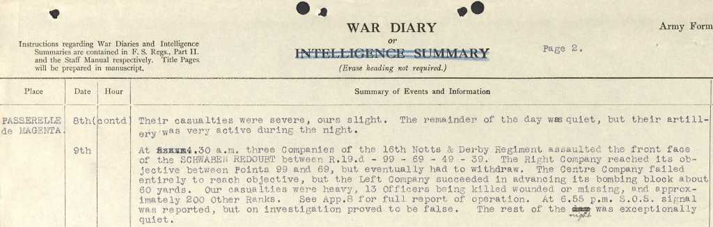 “1 a.m. Enemy barrage opened. VENTELAY neighbourhood + transport lines gassed. About 4.30 a.m. Battalion ordered forward to AISNE LINE……casualties heavy”