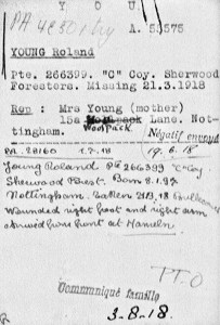 4643/266399 Pte Rowland Young from Nottingham. Arrived in France in October 1915 wounded and taken prisoner in March 1915. Died of influenza in hospital in Germany on 11 November 1918. He is buried in Niederzwenren Cemetery.