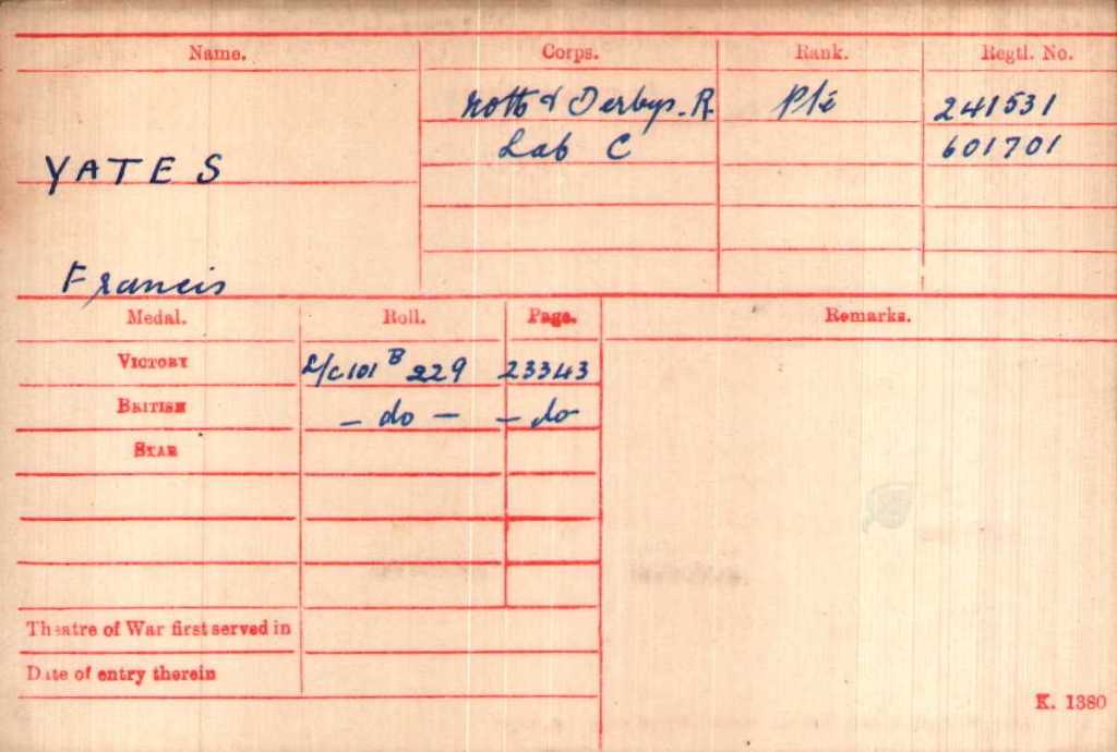 Interestingly his medal index card does not record his 4-digit Regimental number (4478), whilst the 6-digit number (241531) would suggest that he was ‘still with’ the Sherwood Foresters in Spring 1917. His 4-digit number indicates that he enlisted in early August 1915.