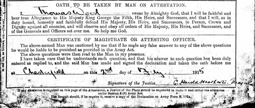Thomas was a 38 year old clerk when he enlisted into the 6th Reserve Battalion, the Sherwood Foresters in Chesterfield on the 2nd May 1915. Thomas had previously served over 18 years with the 2nd Battalion Kings Own Yorkshire Light Infantry and rising to the rank of Colour Sergeant.