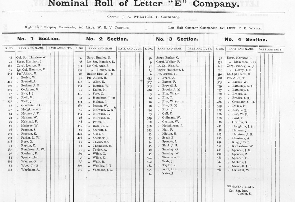 Percy enlisted into the 6th Battalion on its formation on 1st April 1908 and was given the early regimental number of 9. He was assigned to No. 3 Section of the Left Half Company Commanded by 2/Lt Francis Edward Wintle. E Company was Commanded by Captain Joseph Albert Wheatcroft.
