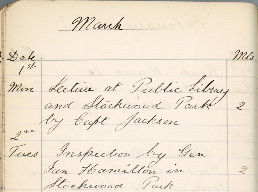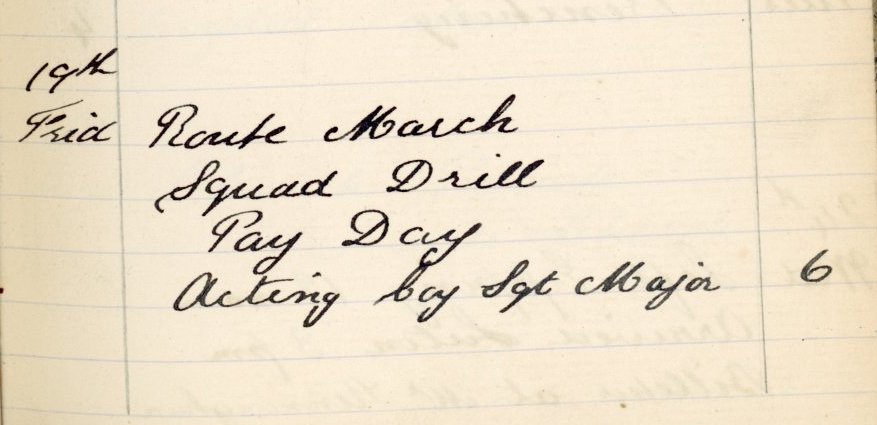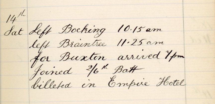 Percy’s diary records the training that they undertook, such as route marches, outpost work and Company/Battalion Drill. During this time Percy and the other men of the Division were billeted in private residences and the diary provides the names and addresses of these houses.