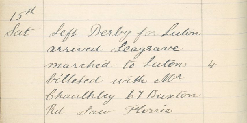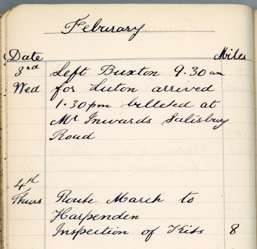 On the outbreak of the War Percy started to keep a diary, which now throws light on those early days of the War and the training undertaken by the North Midland Division in the Harpenden and Luton areas.