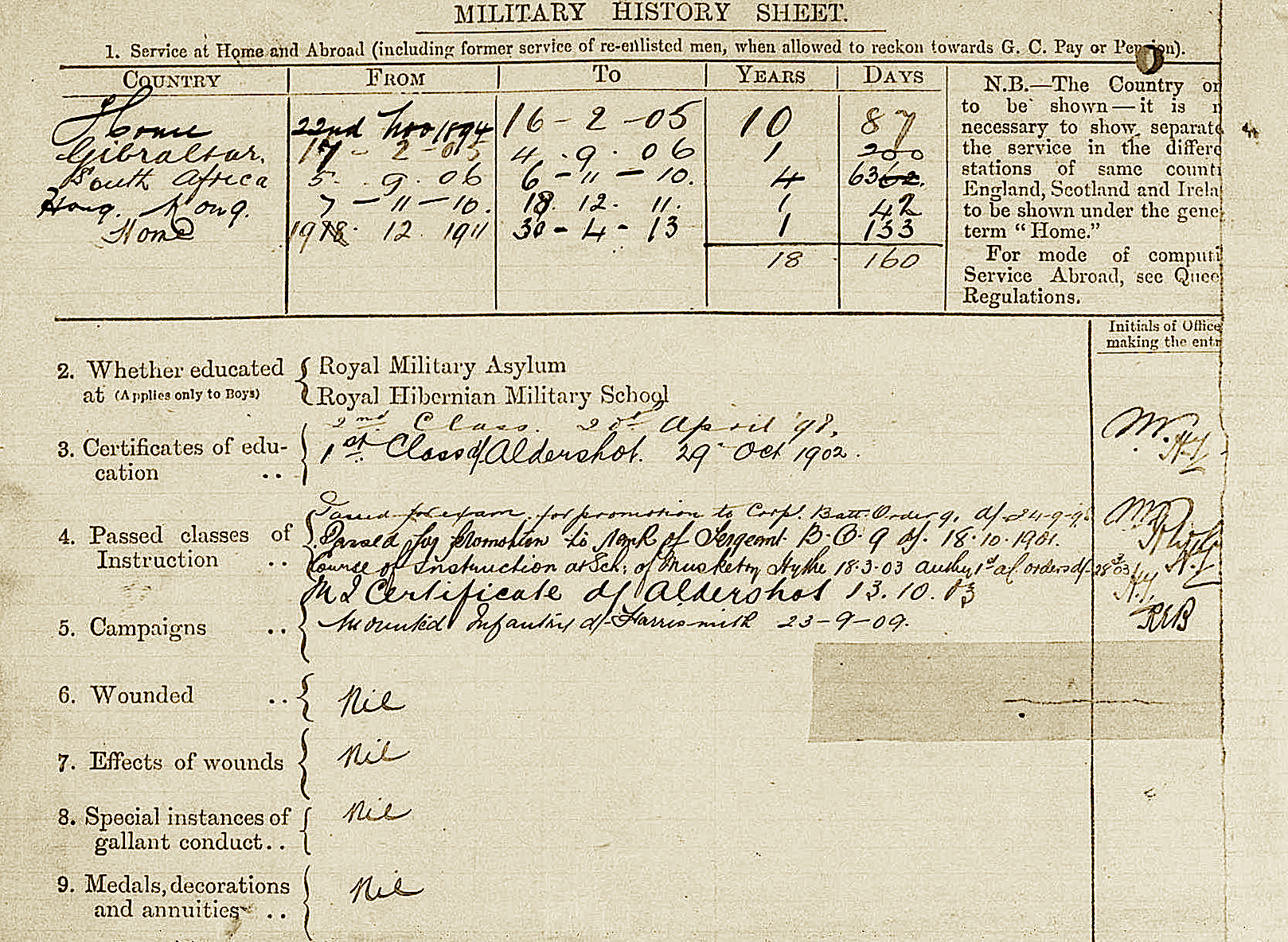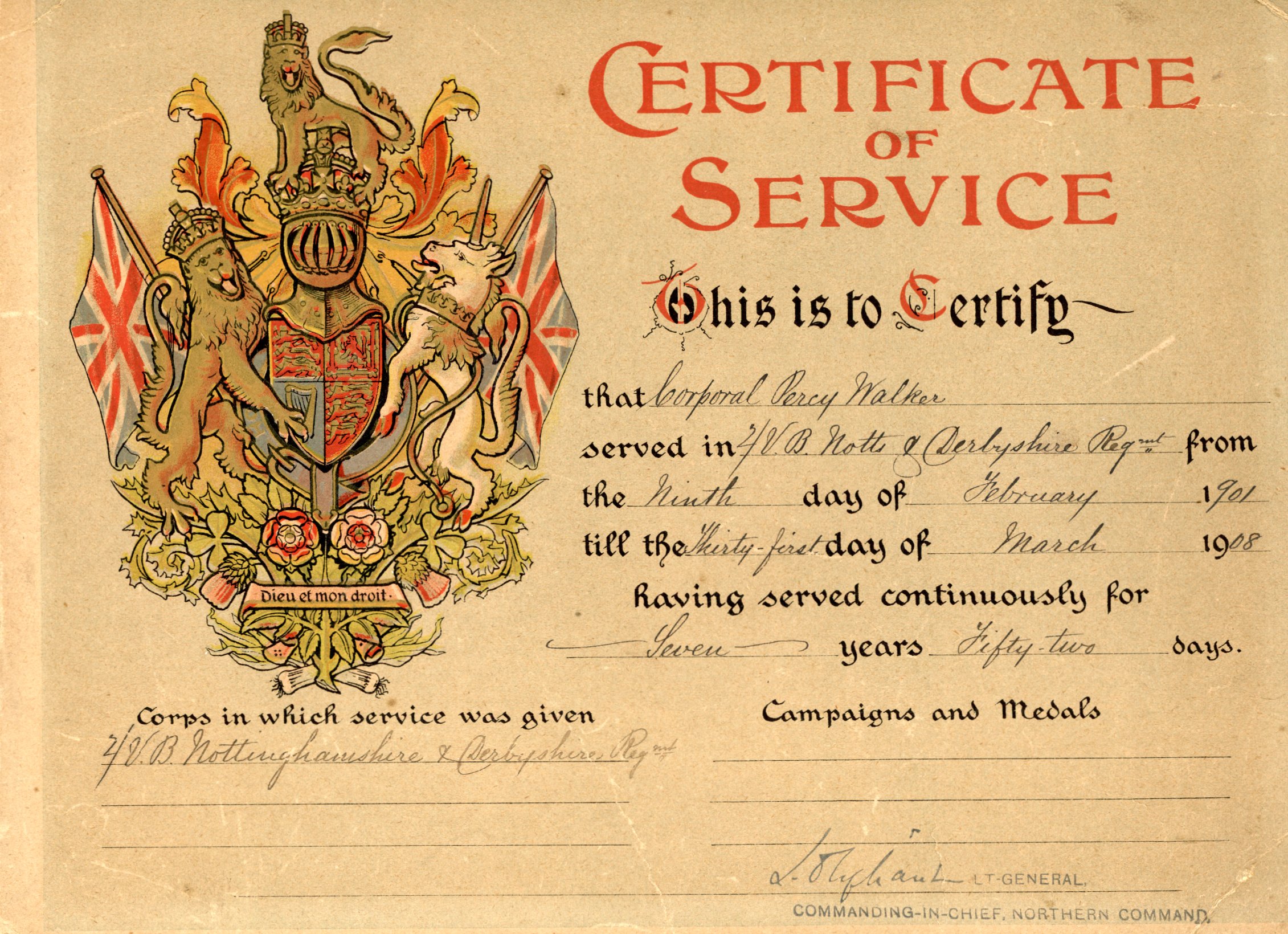 Percy enlisted into the 2VB on the 9th of February 1901 aged 19, and served with them until their disbandment on the 31st March 1908, during which time he rose to the rank of Corporal.