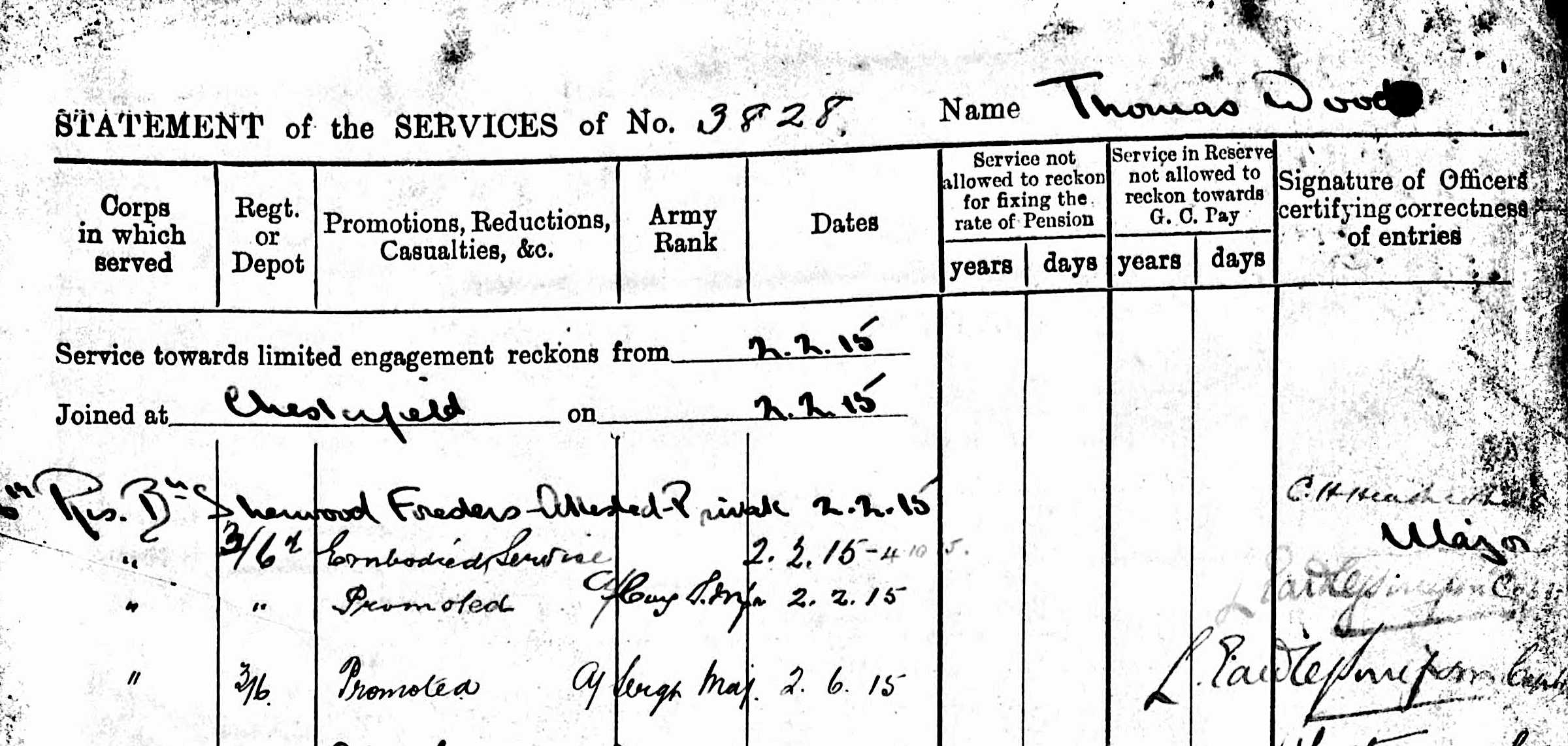 Thomas was a 38 year old clerk when he enlisted into the 6th Reserve Battalion, the Sherwood Foresters in Chesterfield on the 2nd May 1915. Thomas had previously served over 18 years with the 2nd Battalion Kings Own Yorkshire Light Infantry and rising to the rank of Colour Sergeant.