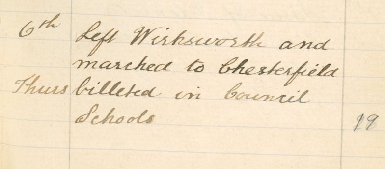 Percy’s diary records the training that they undertook, such as route marches, outpost work and Company/Battalion Drill. During this time Percy and the other men of the Division were billeted in private residences and the diary provides the names and addresses of these houses.