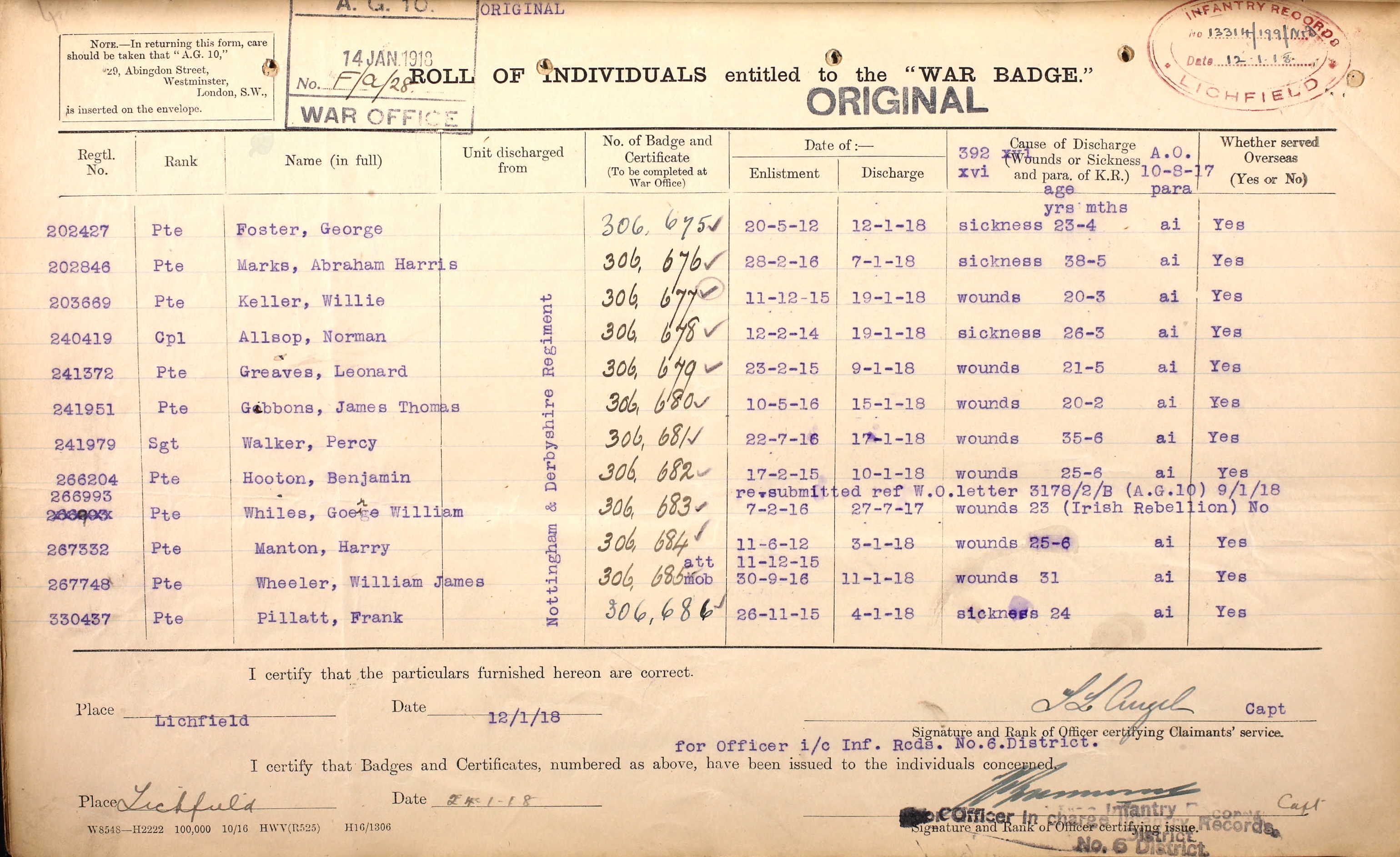 Fred was still serving with the 1/7th Battalion at the time of the Territorial Force renumbering and was issued with the Regimental number 265172, which was with the block assigned to the 7th Battalion Sherwood Foresters (265001-305000).