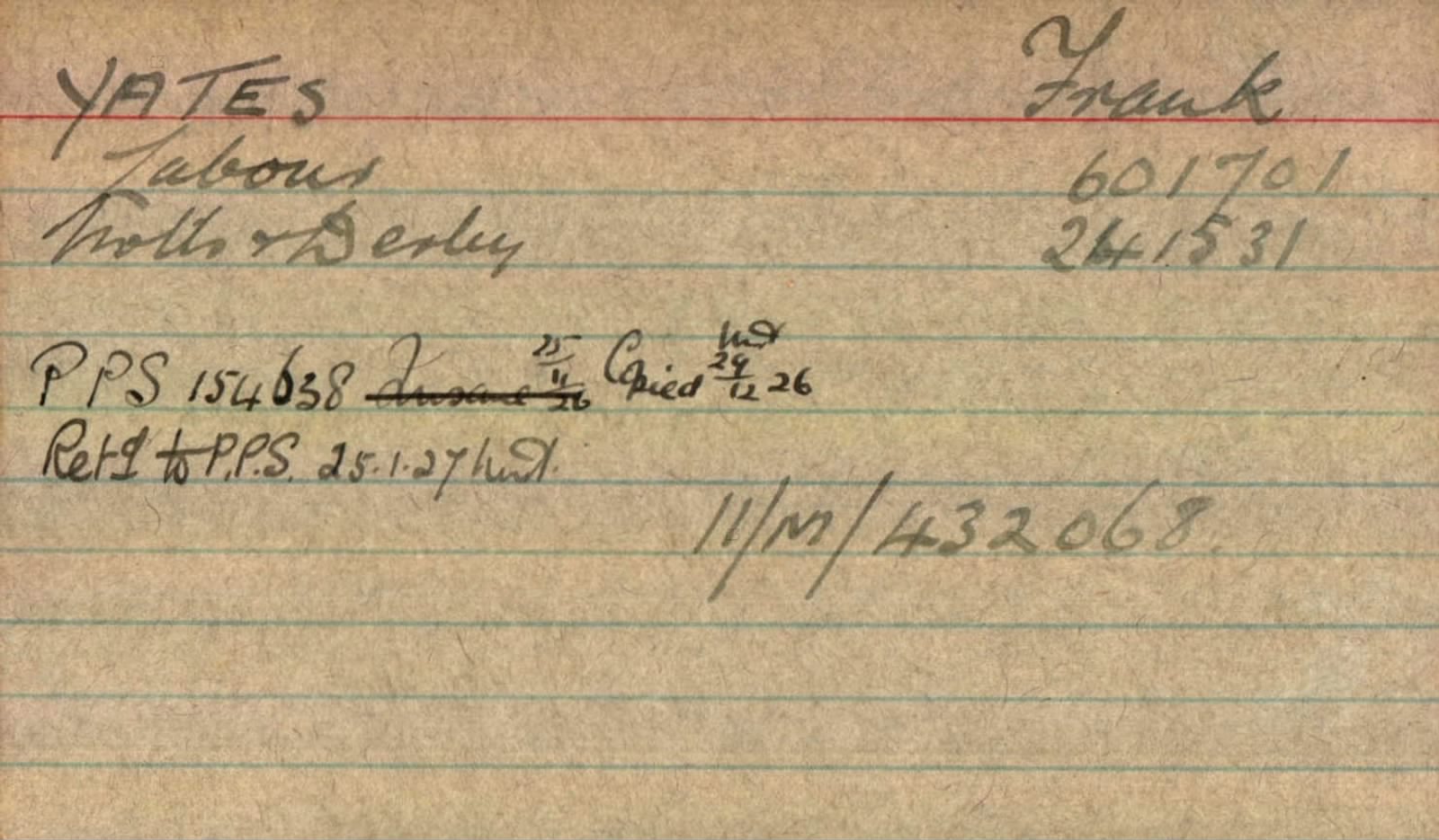 Unfortunately very little is known about Francis Yates, but it would appear that he arrived in France in 1916, served with “B” Company and was wounded on the 1st July 1916 [Information from 1/6th Battalion casualty book formerly kept in Officers Mess at Chesterfield Drill Hall].