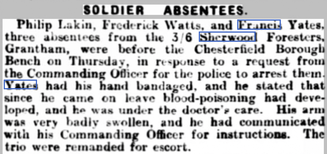 Indeed, there is a reference in the Grantham Journal on Saturday October 16 1915, that Privates Philip Larkin, Frederick Watts and Francis Yates of the 3/6th Battalion where brought before Chesterfield Borough Bench for being ‘absent without leave’. At the time the 3/6th Battalion were camped at Belton Park with the rest of the 3rd North Midland Division.