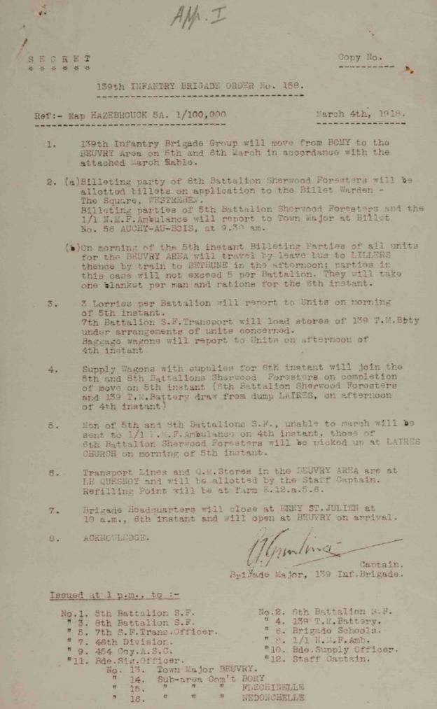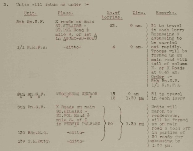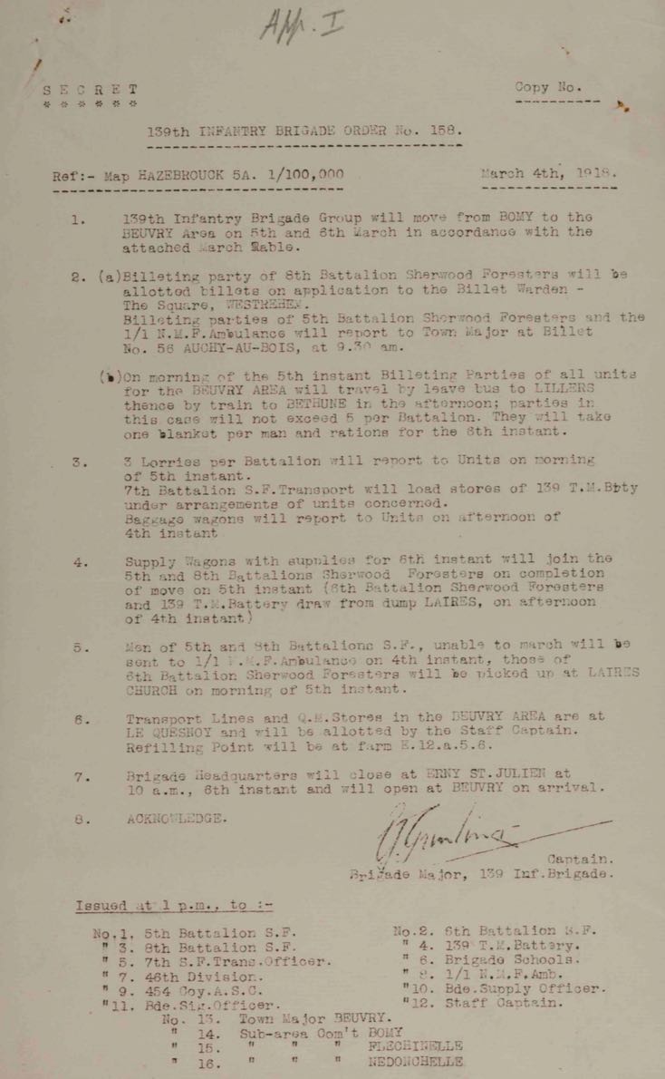 6th March: Bde Group move from BOMY and ST HILAIRE area to BEUVRY area by motor lorry. Destinations of units are:-