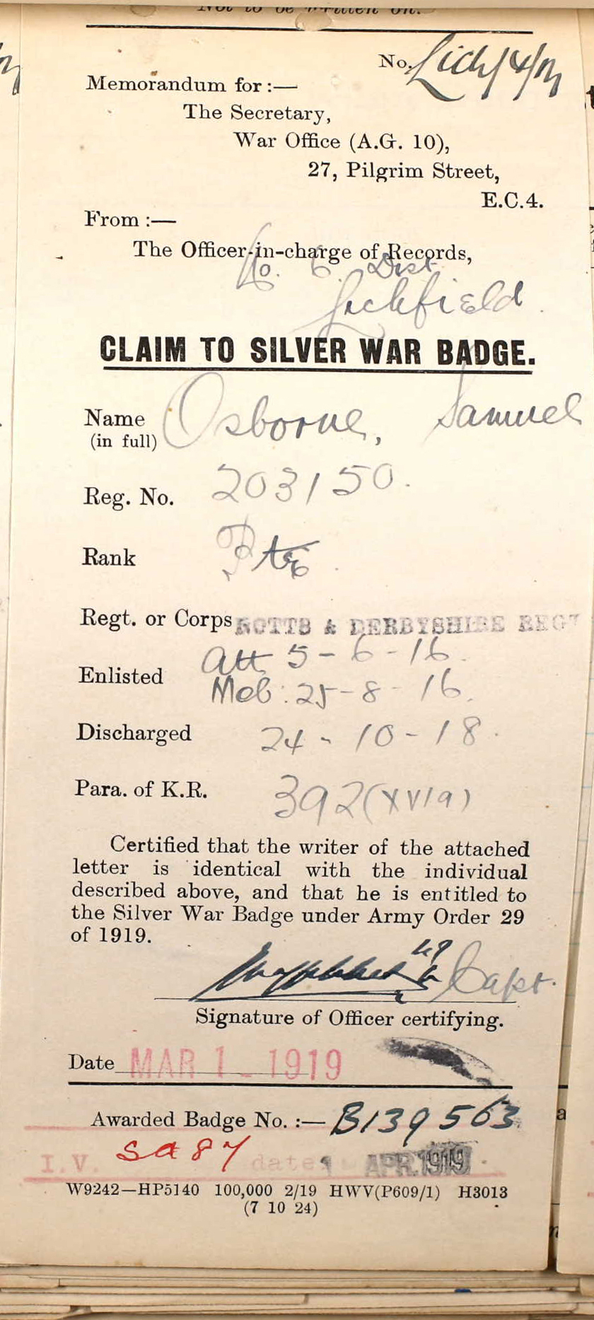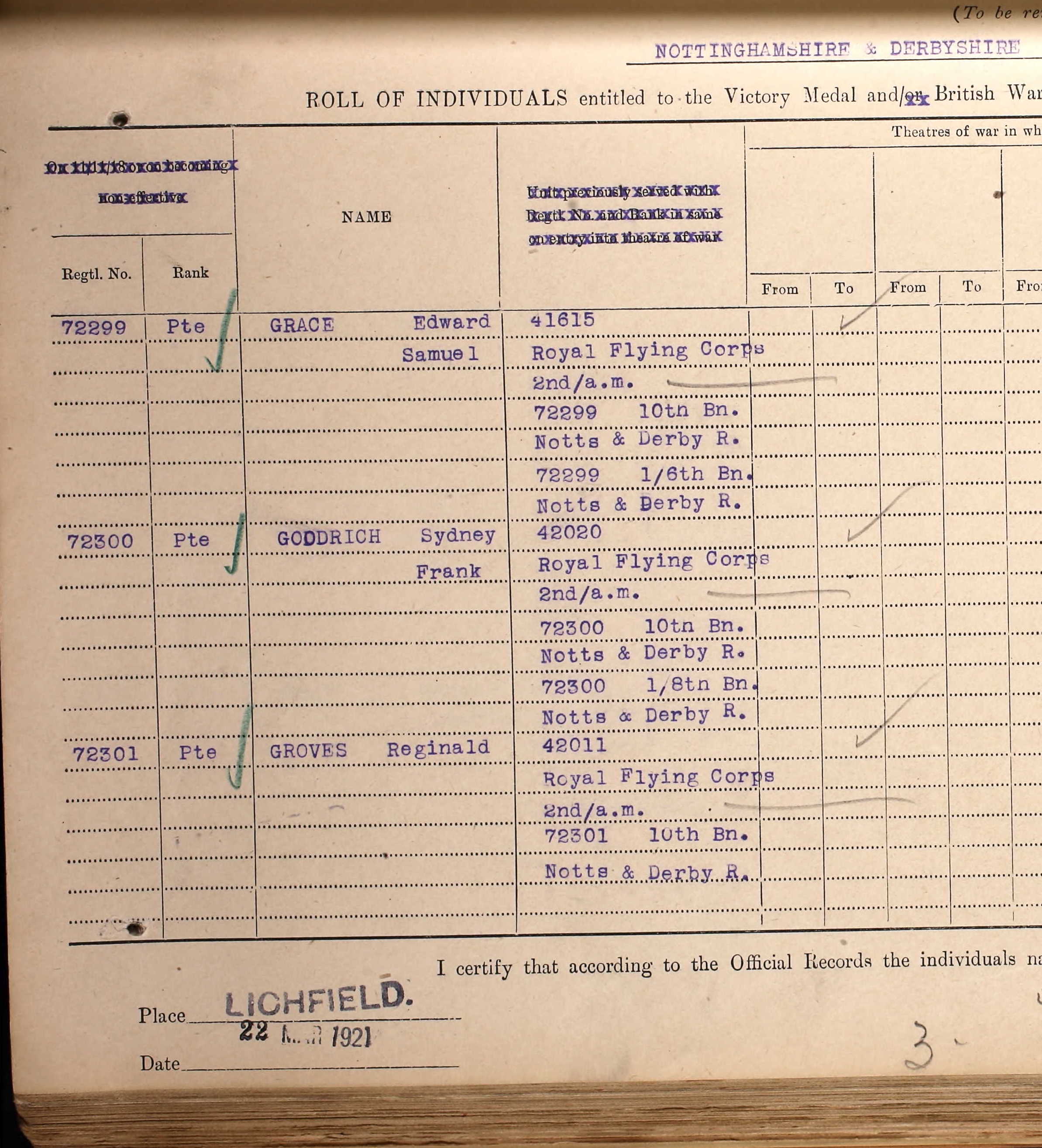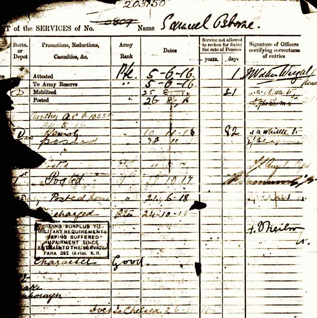 Samuel was one of approximately 93 men who were transferred to the 10th Battalion Sherwood Foresters from the Royal Flying Corps [date currently unknown]. He was subsequently posted to 1/6th Battalion.