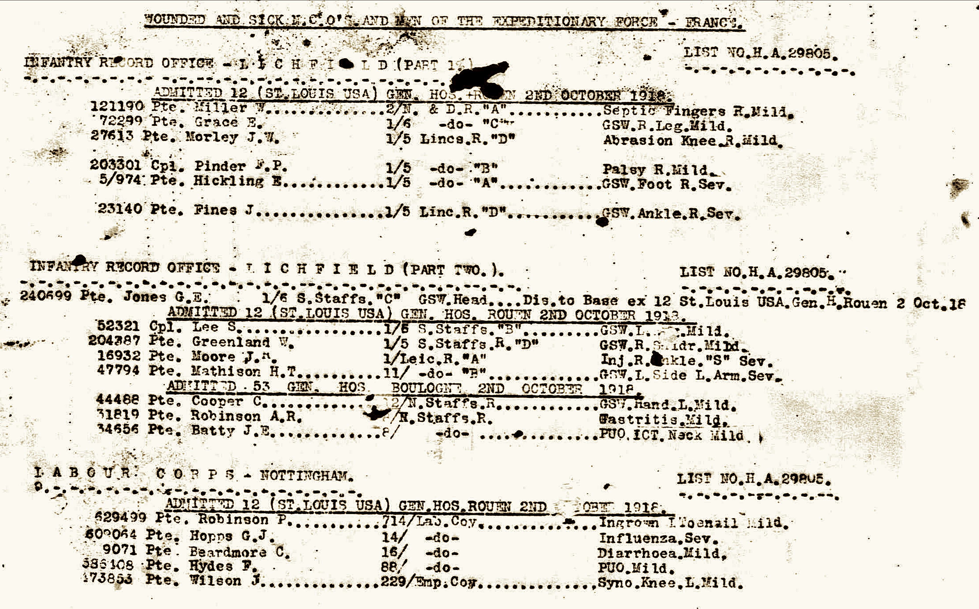 Edward appears on a wounded and sick list [H.A.29805], which records that he was admitted to the 12 (St Louis USA) General Hospital in Rouen on the 2nd October 1918. It is most likely that he was wounded during the 46th North Midland Division attack o the Hindenburg Line – see here.