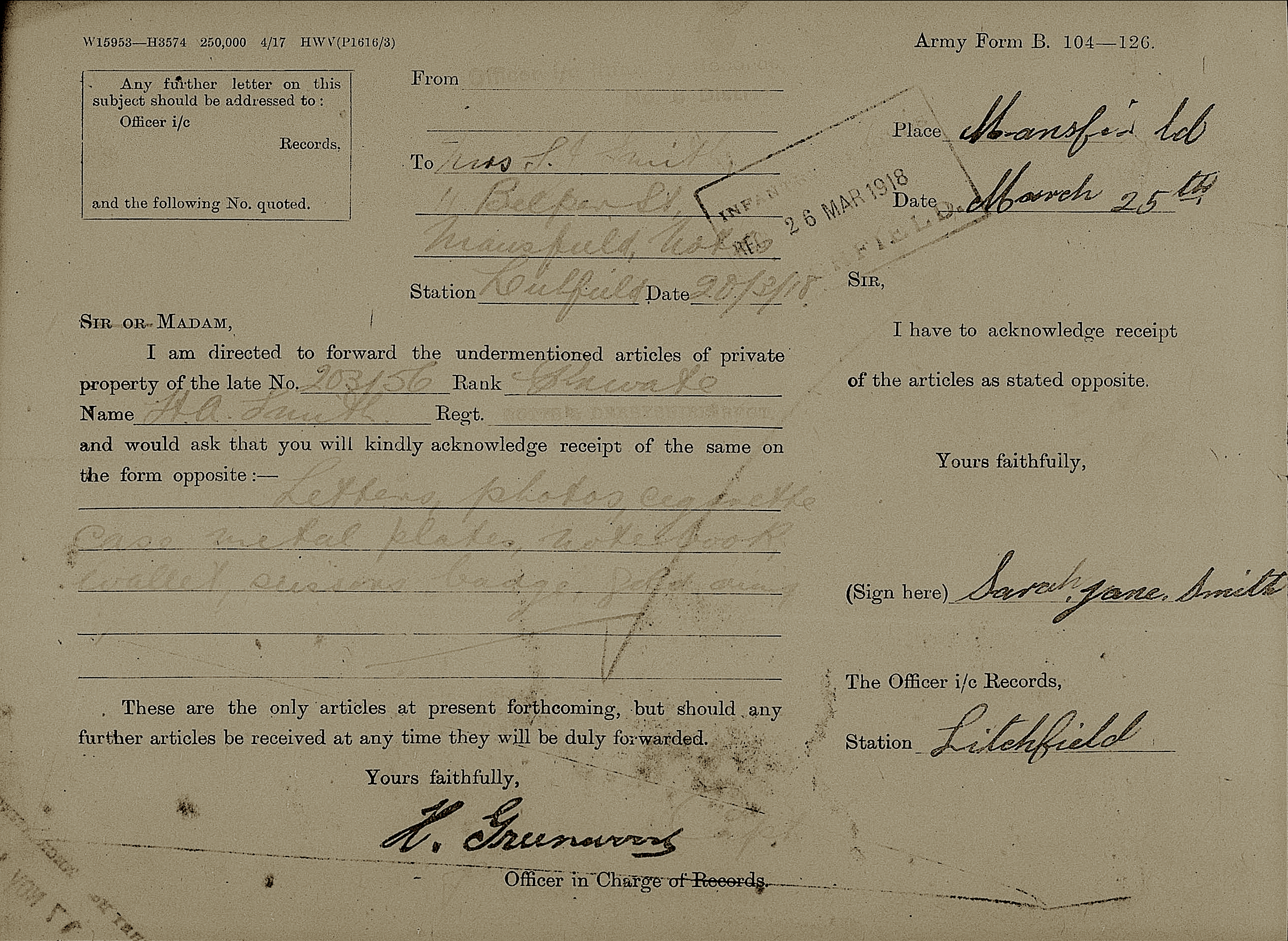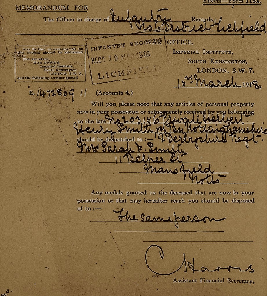 The Infantry Records Department of No. 6 District (Lichfield) were not instructed to dispatch Hebert’s belongings to Sarah (his mother) until 15th March 1918 and she finally received them around 25th March.