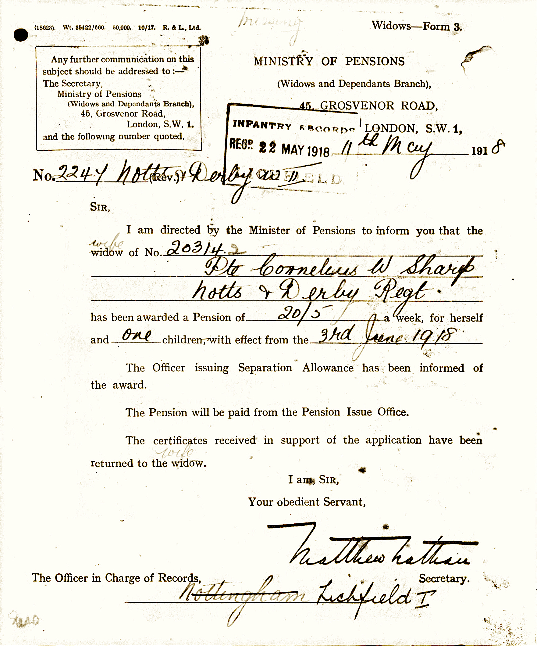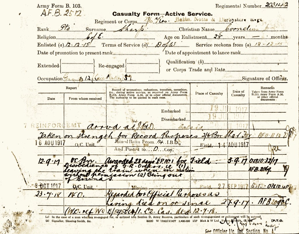 203142 Private Cornelius William Sharp, a 28 year old lace maker from Nottingham attested in December 1915. He was mobilised in November 1916 and posted to the 5th Reserve Battalion in Louth.