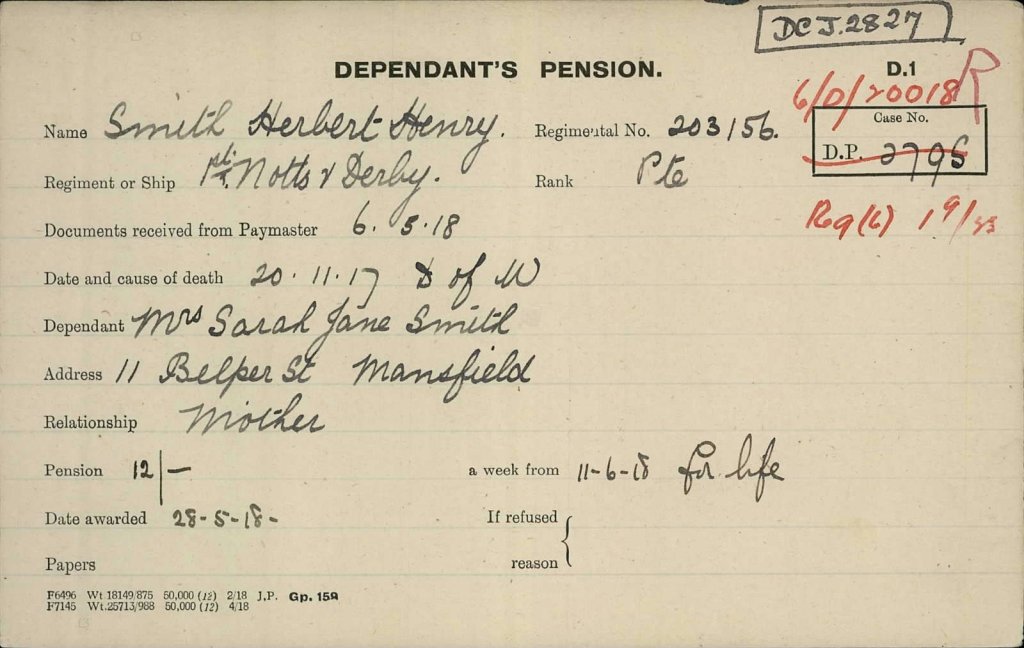 A very poignant letter from the mother of Herbert Henry Smith from Mansfield to the War Office and received on the 11 February 1918