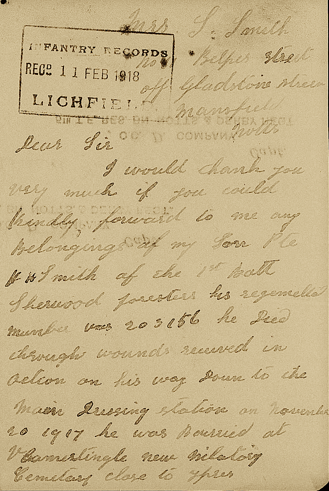 “Dear Sir, I would thank you very much if you could kindly forward to me any belongings of my son, Pte HH Smith of the 1st Batt Sherwood Foresters……..he died through wounds received in action on his was way down to the main dressing station on November 20 1917”