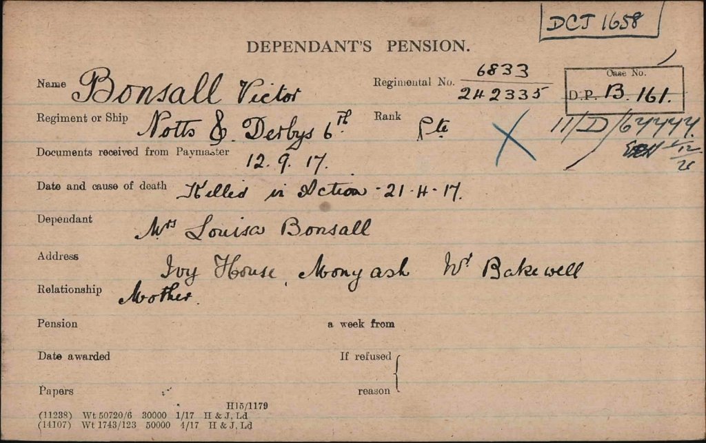 Victor was the son of Richard and Louisa Bonsall of Monyash, Bakewell in Derbyshire.
