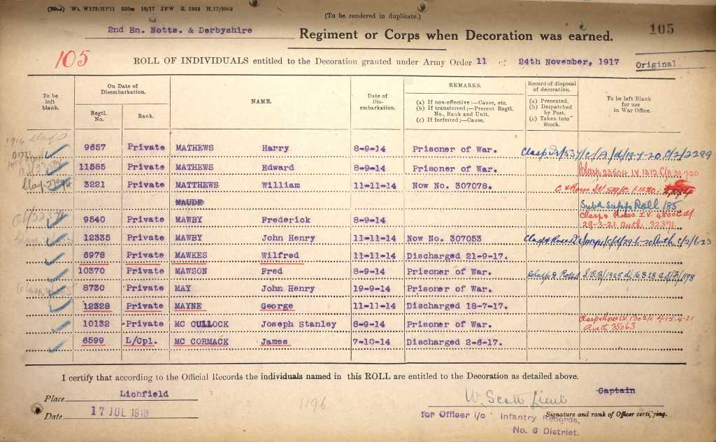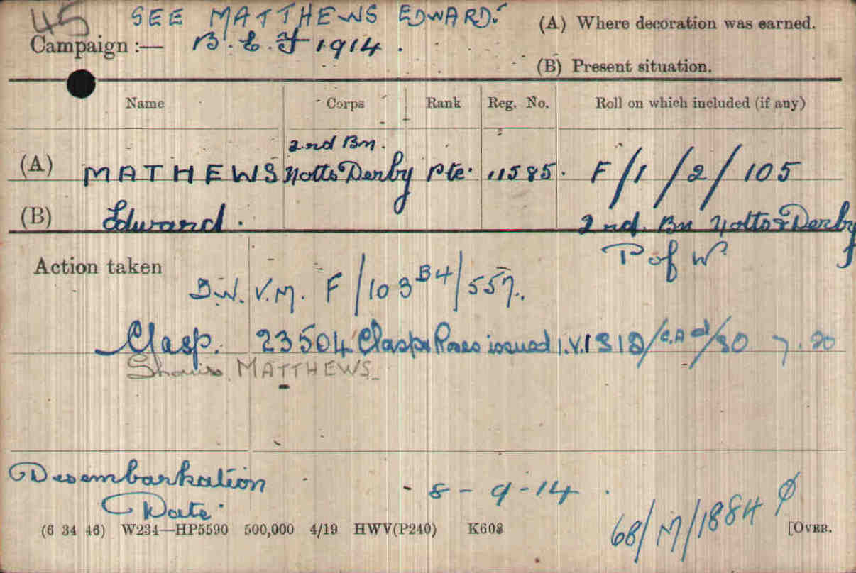 Edward Matthews was born in August 1892 and enlisted into into the Sherwood Foresters in March 1911 aged 19.