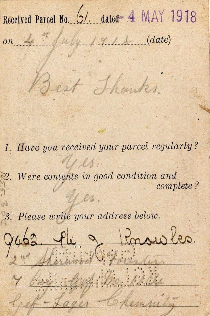 During that time he received a parcel from the Sherwood Foresters Prisoners of War Regimental Care Committee, which provided him with a variety of items to make his life more comfortable as a POW.
