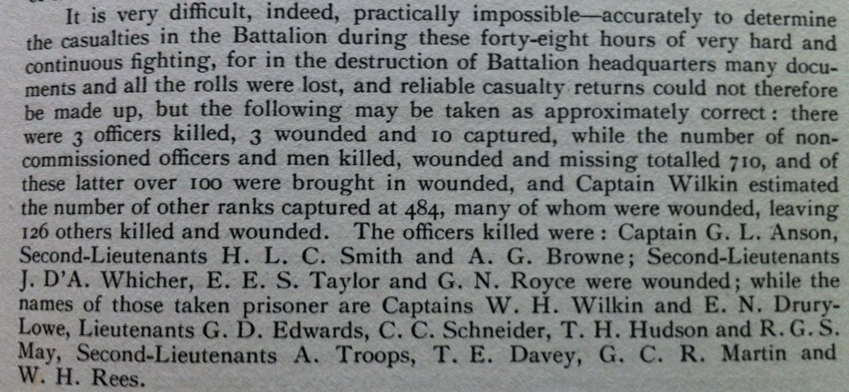 Our casualties amounted to three other ranks killed, including a very gallant N.C.O., Corpl. Tyne, 26 other ranks missing, and one Officer (Hartle), and ten other ranks wounded. We should like to pay tribute to the excellent work done by the Signallers, who as usual worked their hardest, to try and keep their lines in order, in spite of the heavy shelling. L.-Corpl. Parry’s efforts to repair the broken lines back from one of the front Companies, were especially praiseworthy.