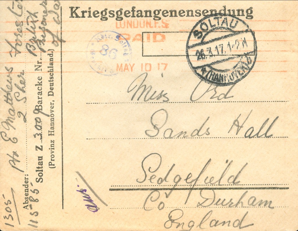 Sent by John Knowles in May 1918 from Chemitz POW CampSent by Edward Mathews to Miss Ord in March 1917 from Soltau POW Camp