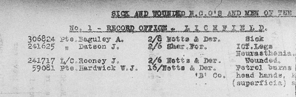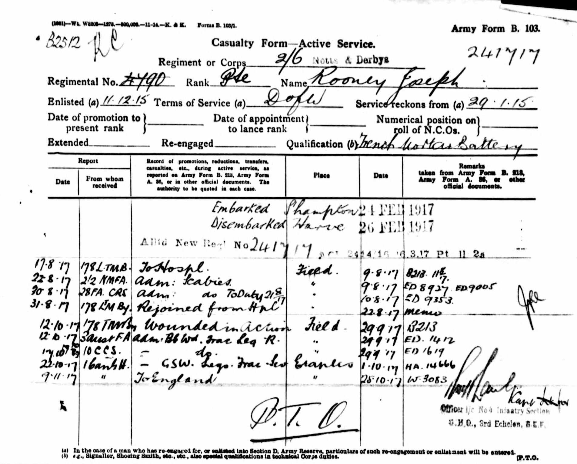 4790/241717 Joseph Michael Rooney was from Barrow Hill in Chesterfield. He attested on 11th December 1915 and was posted to the 3/6th Battn in February 1916. He later transferred to the 2/6th Battn and arrived in France on the 26th February 1917. Joseph was wounded in action at Ypres on the 29th September (GSW legs) and after treatment in the 1st Canadian General Hospital was transferred to England on the 27th October 1917.