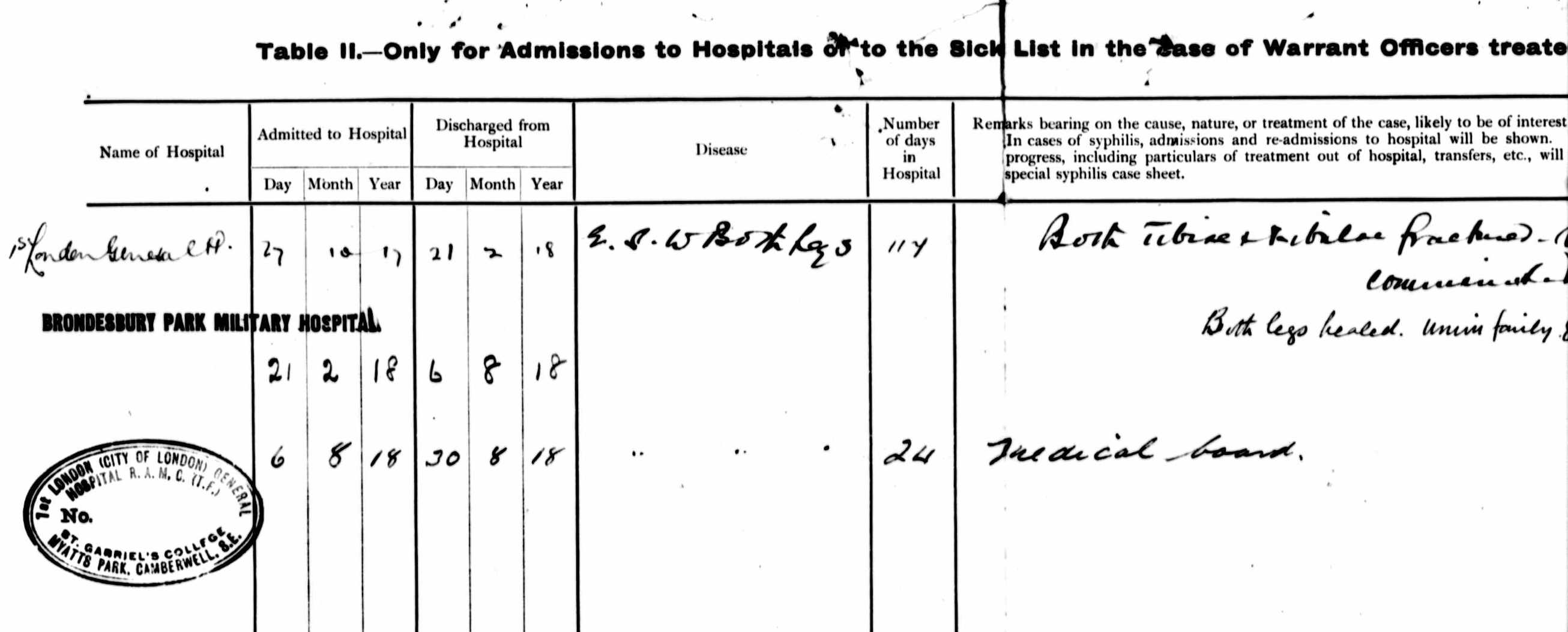 Joseph suffered a fractured tibia and fibula and was discharged on the 17th September 1918. Unfortunately he died in November 1918. For more information of Joseph see here and here.