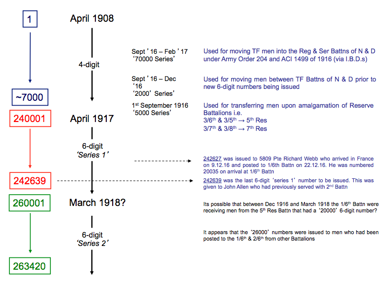 Until the beginning of 1917 each man in a Territorial Force unit (such as an infantry Battalion) was numbered using a scheme that was unique to that unit. In the case of the 6/Sherwood Foresters the number 1 was allocated to the first man to join the unit on its formation in 1908 (WN Broomhead) and successive numbering continued from there. This Battalion numbering would have been performed in the first instance by the Battalion staff of the 1/6th Battalion, and then subsequently by the staff of the 2/6th Reserve Battalion on its formation in September 1914 and then by the 3/6th Reserve Battalion (formed March 1915) as new recruits joined from 1914-15 onwards.