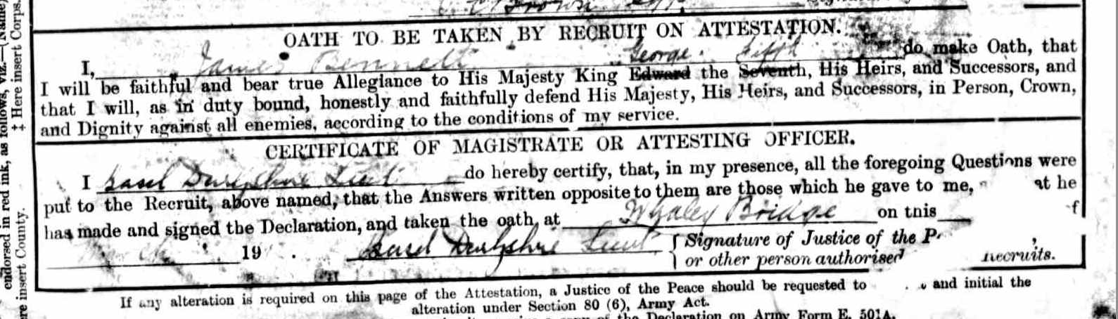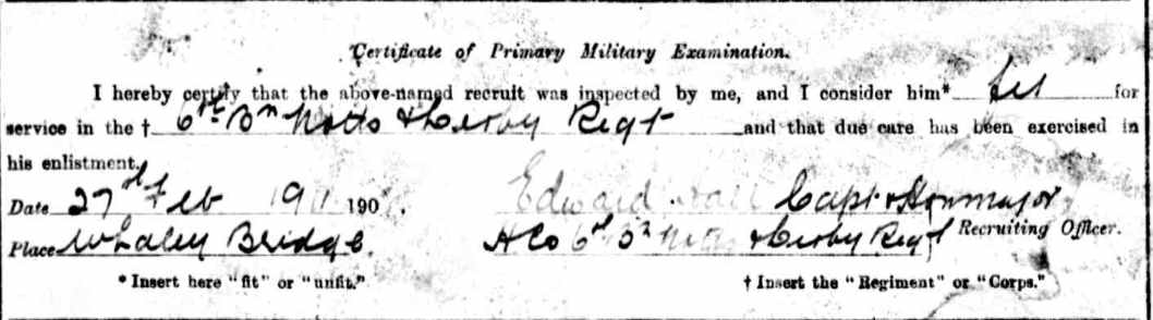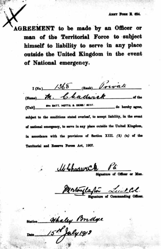 Imperial Service Agreement signed by 1368 Pte Morris Chadwick in Whaley Bridge on the 15th July 1912.