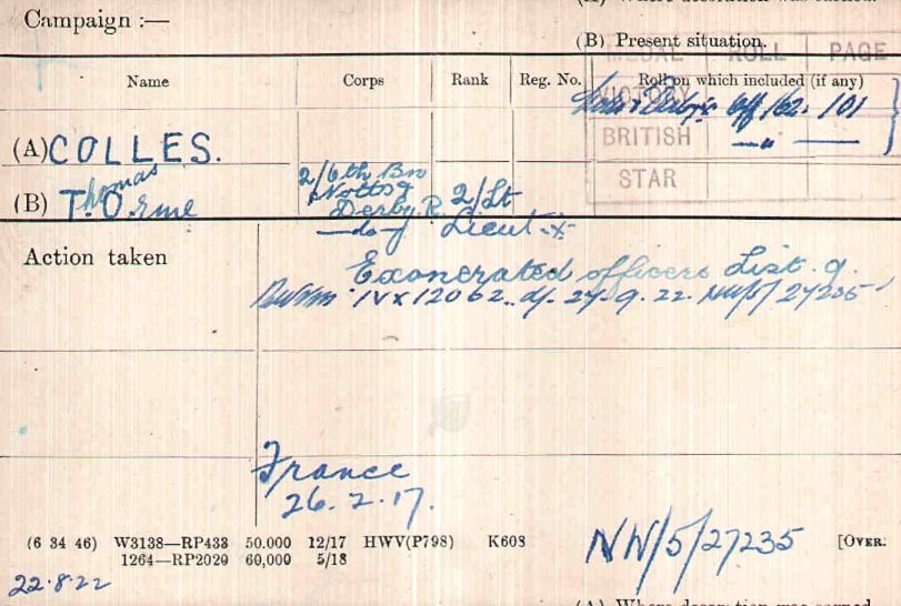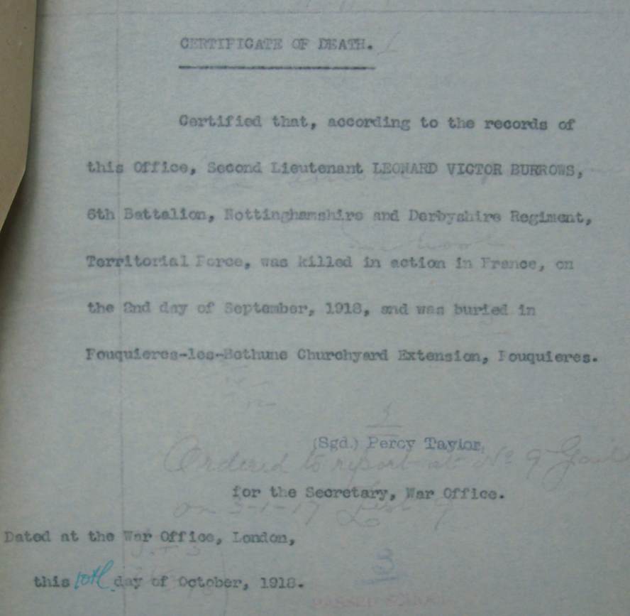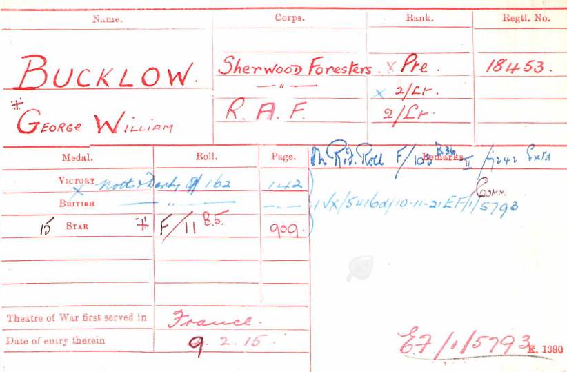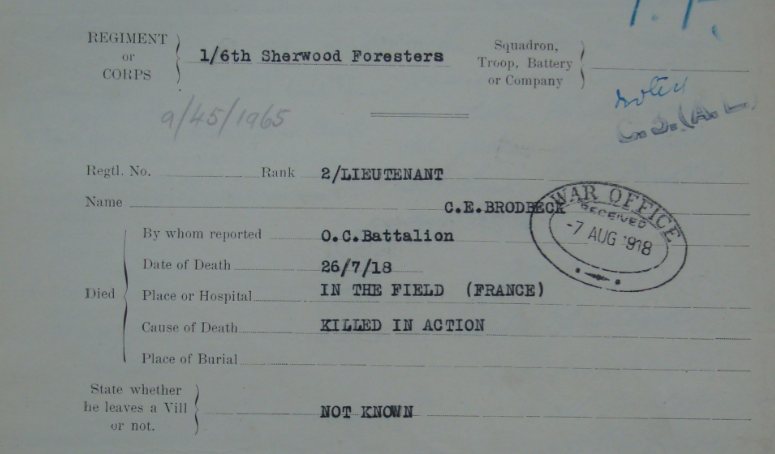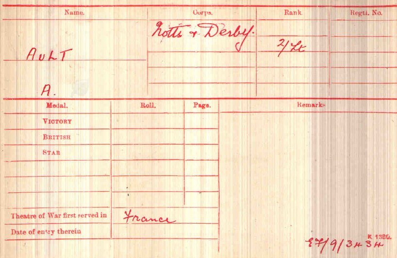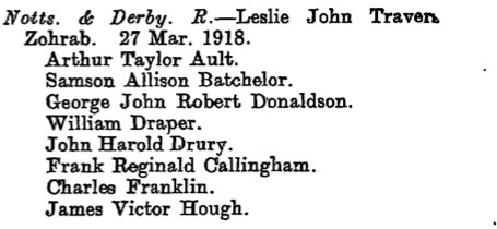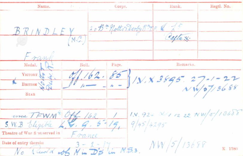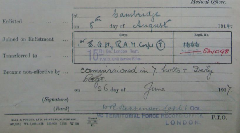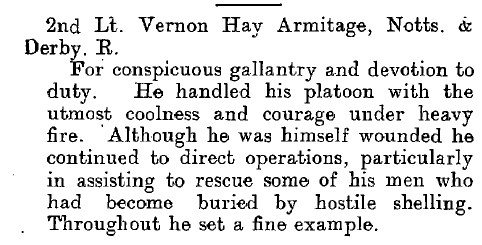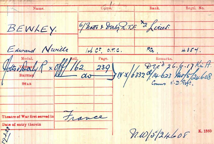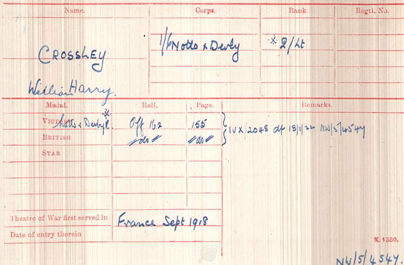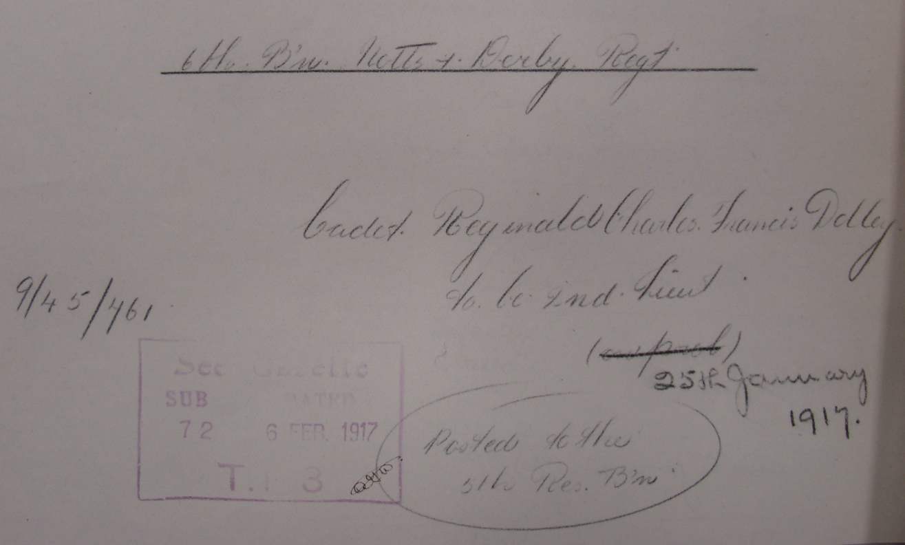 Recommended as a suitable candidate for admission to an Officer Cadet Unit with a view to appointment to a Commission more especially in the Machine Gun Corps 1917. He was admitted to No 1 Officer Cadet Battalion at Newton Fevers on in November 1917. Discharged to a Commission in April 1918, to the 3rd Battalion Sherwood Foresters London Gazette 6th May 1918.