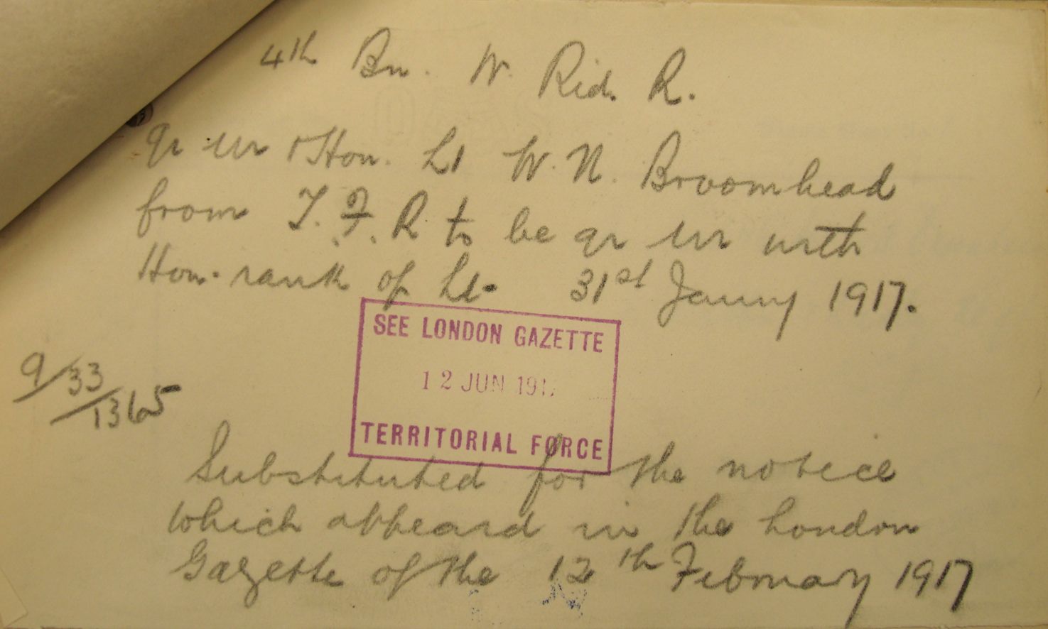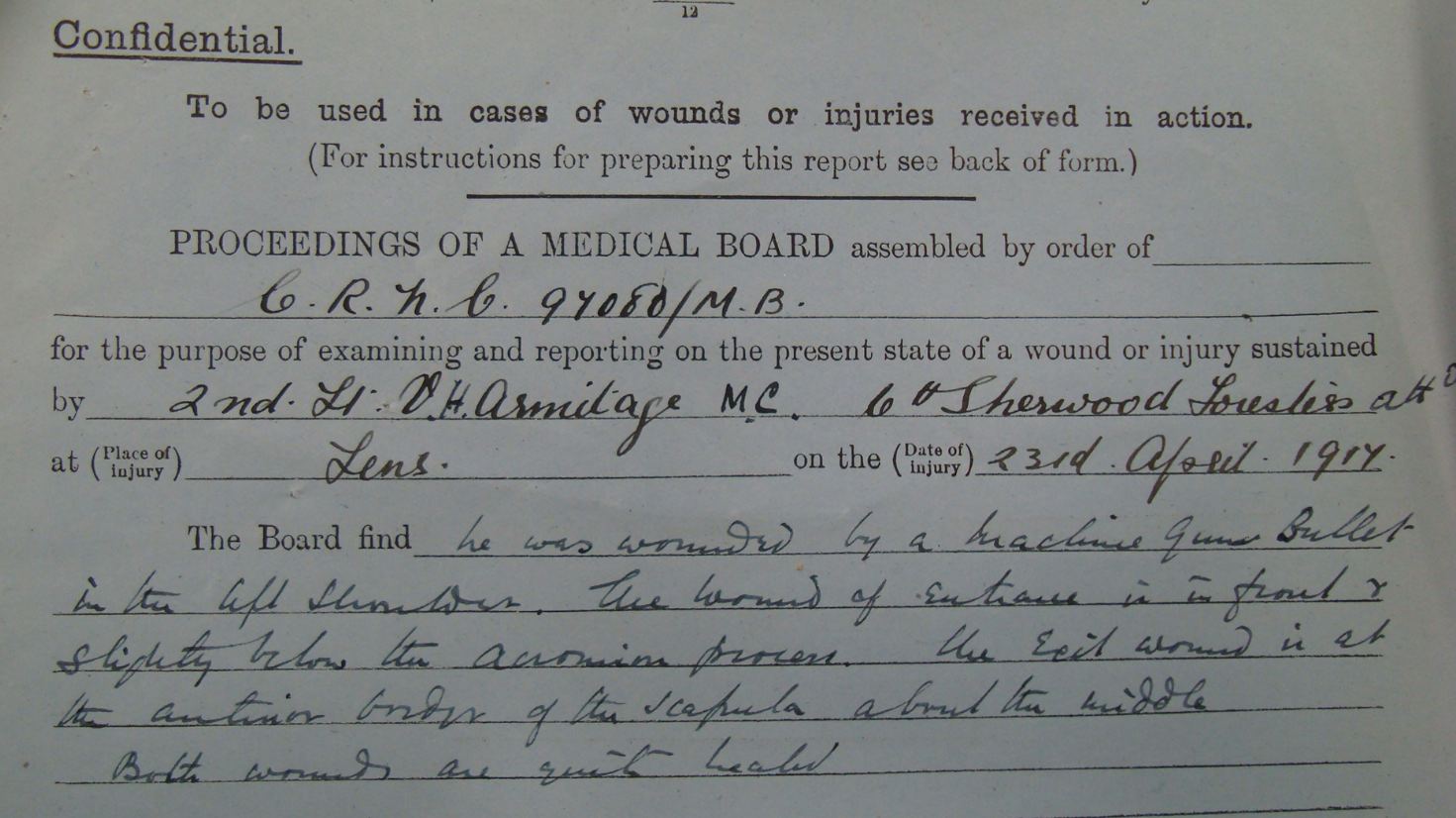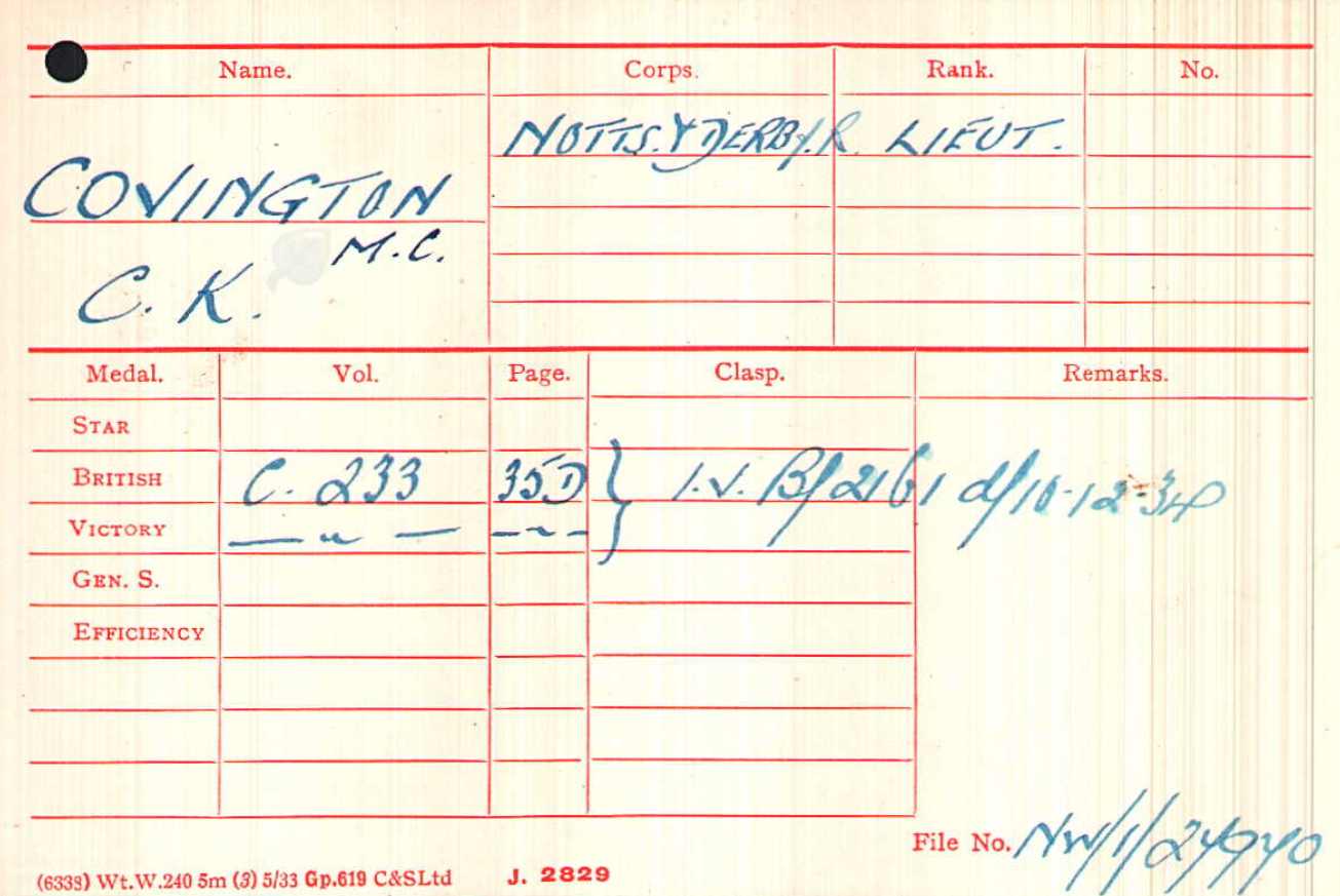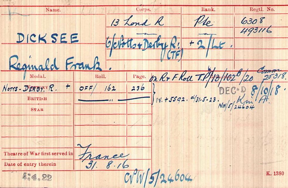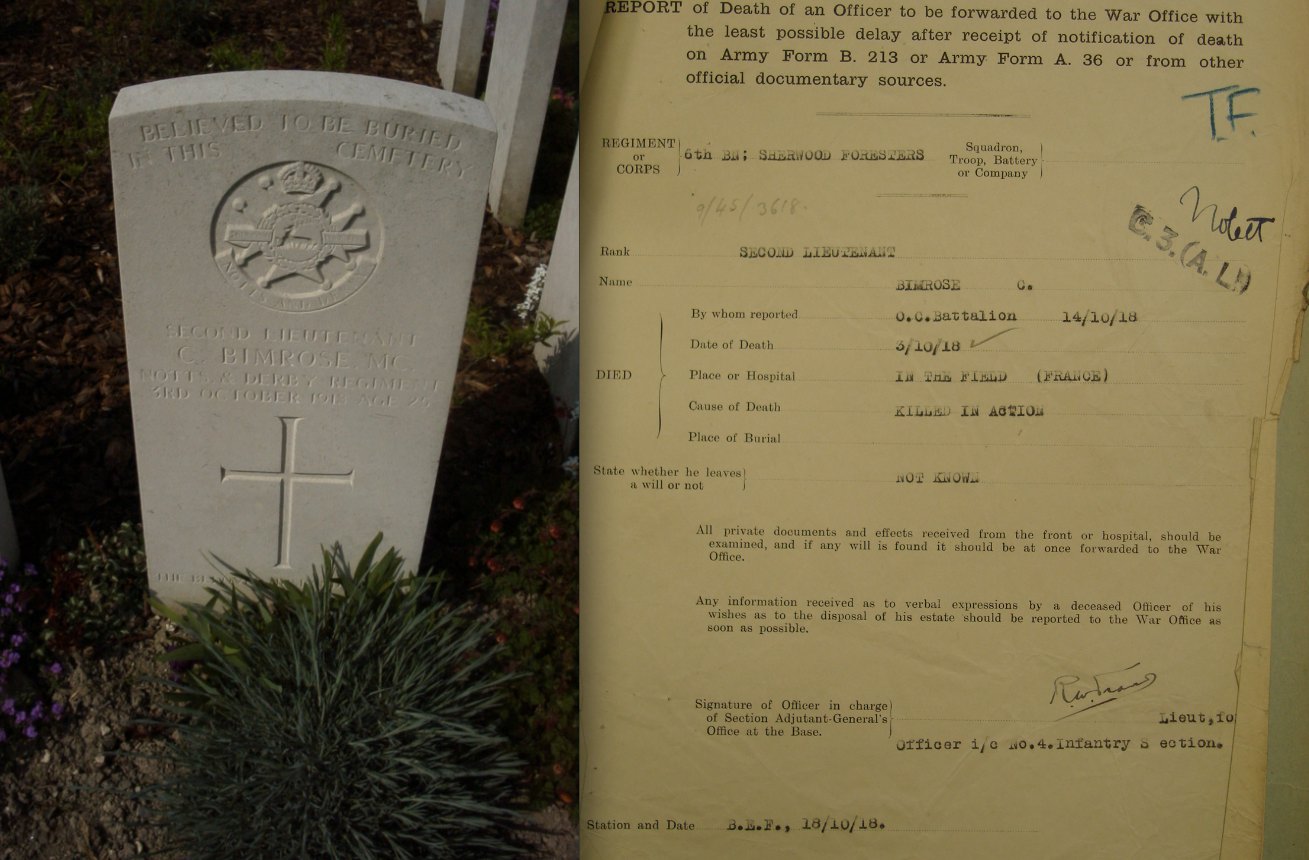 Recommended as a suitable candidate for admission to an Officer Cadet Unit with a view to appointment to a Commission more especially in the Machine Gun Corps 1917. He was admitted to No 1 Officer Cadet Battalion at Newton Fevers on in November 1917. Discharged to a Commission in April 1918, to the 3rd Battalion Sherwood Foresters London Gazette 6th May 1918.