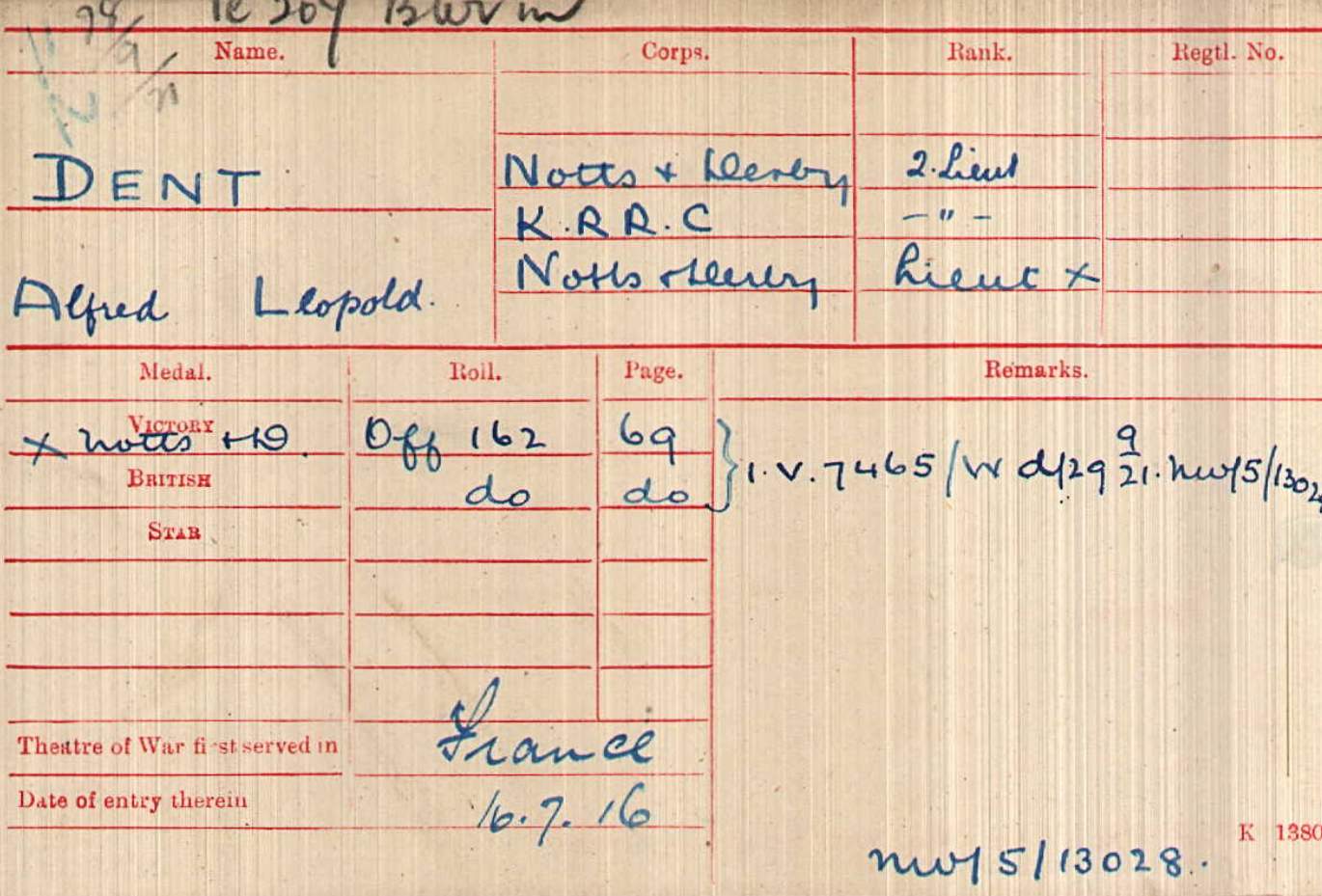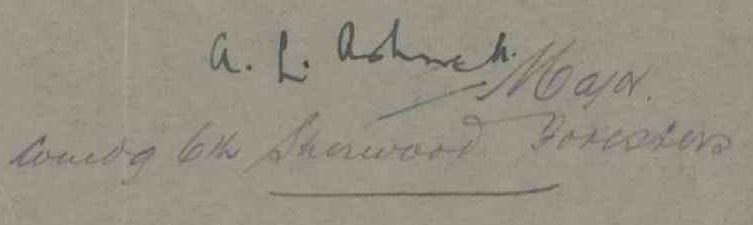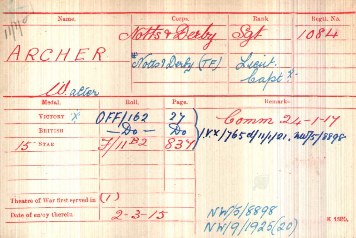 Sergeant 1084 and arrived in France on 2nd March 1915. Commissioned 24th January 1917. Lived at Willow Grange in Lamberley, Nottinghamshire.