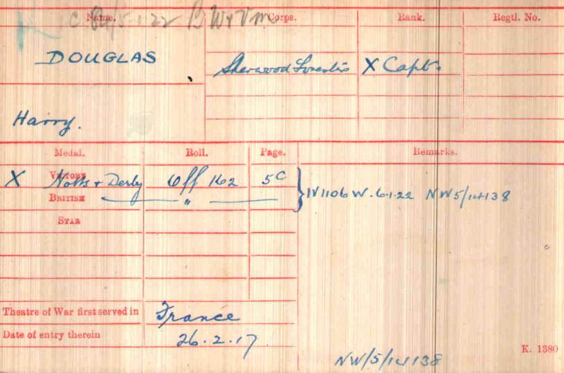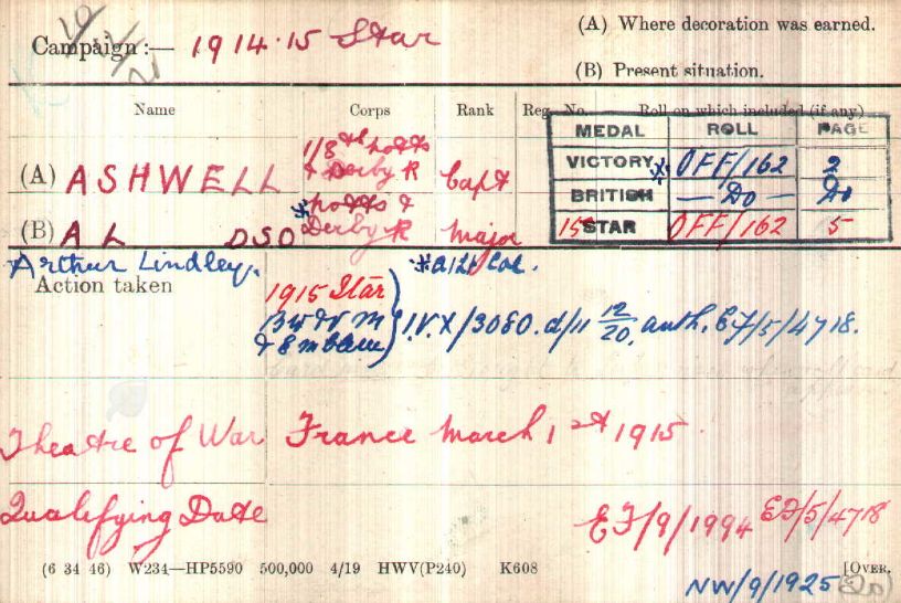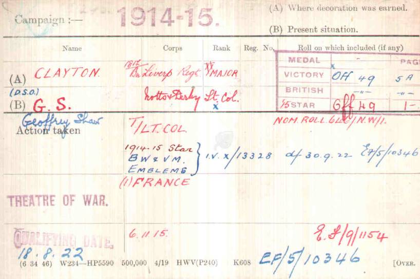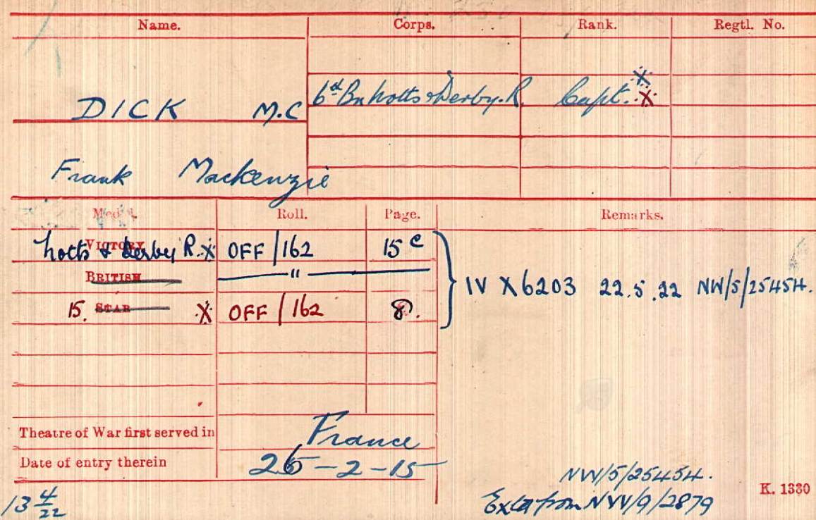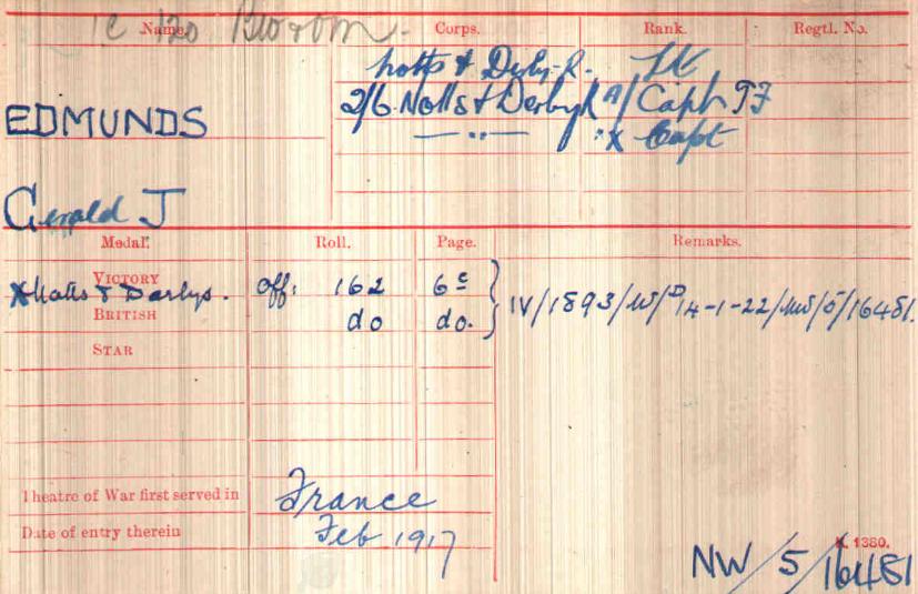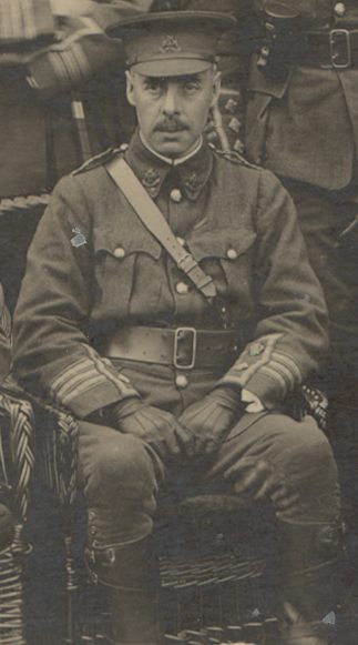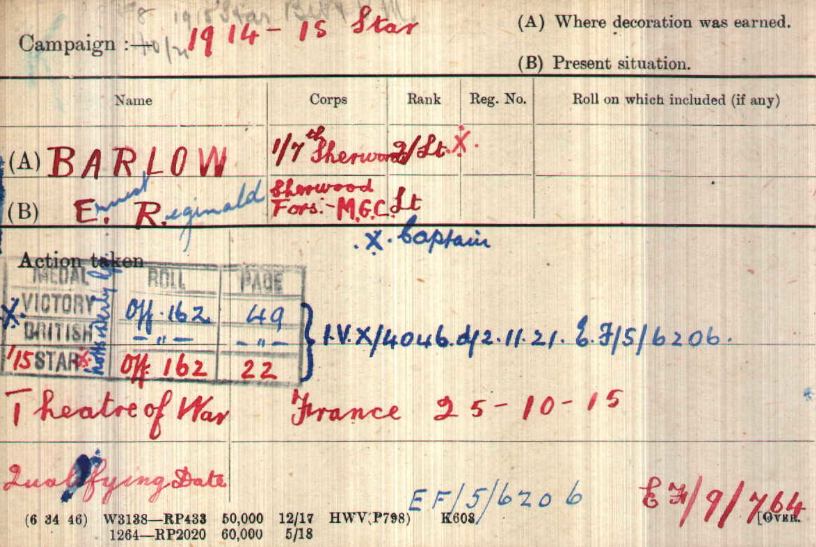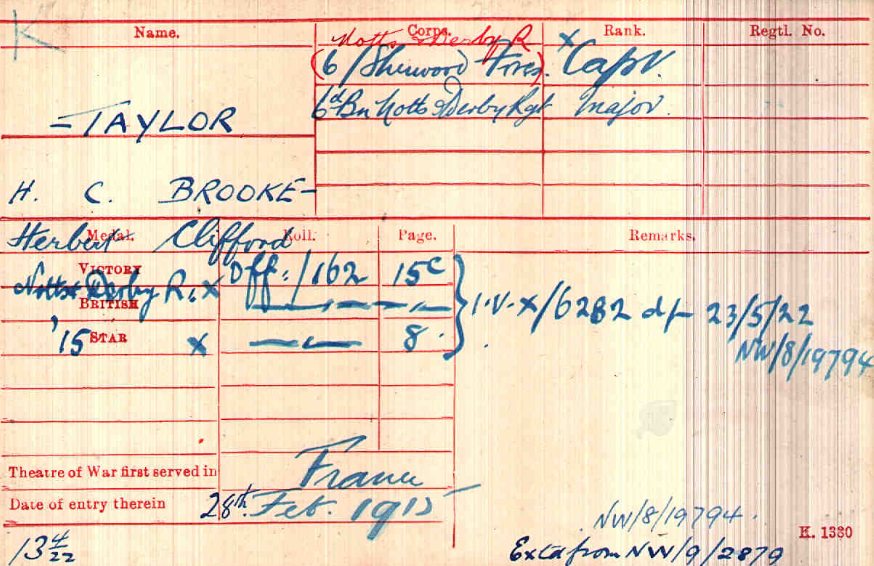 At Braintree in Feb 1915. Arrived in France in February 1915 Took over Command of 8th Sherwood Foresters at Loos on 15th October 1915. Transferred to 8th Sherwood Foresters and promoted Temp Lt/Col on 3rd December 1915. LG MID January 1917 LG DSO January 1917.