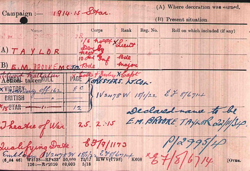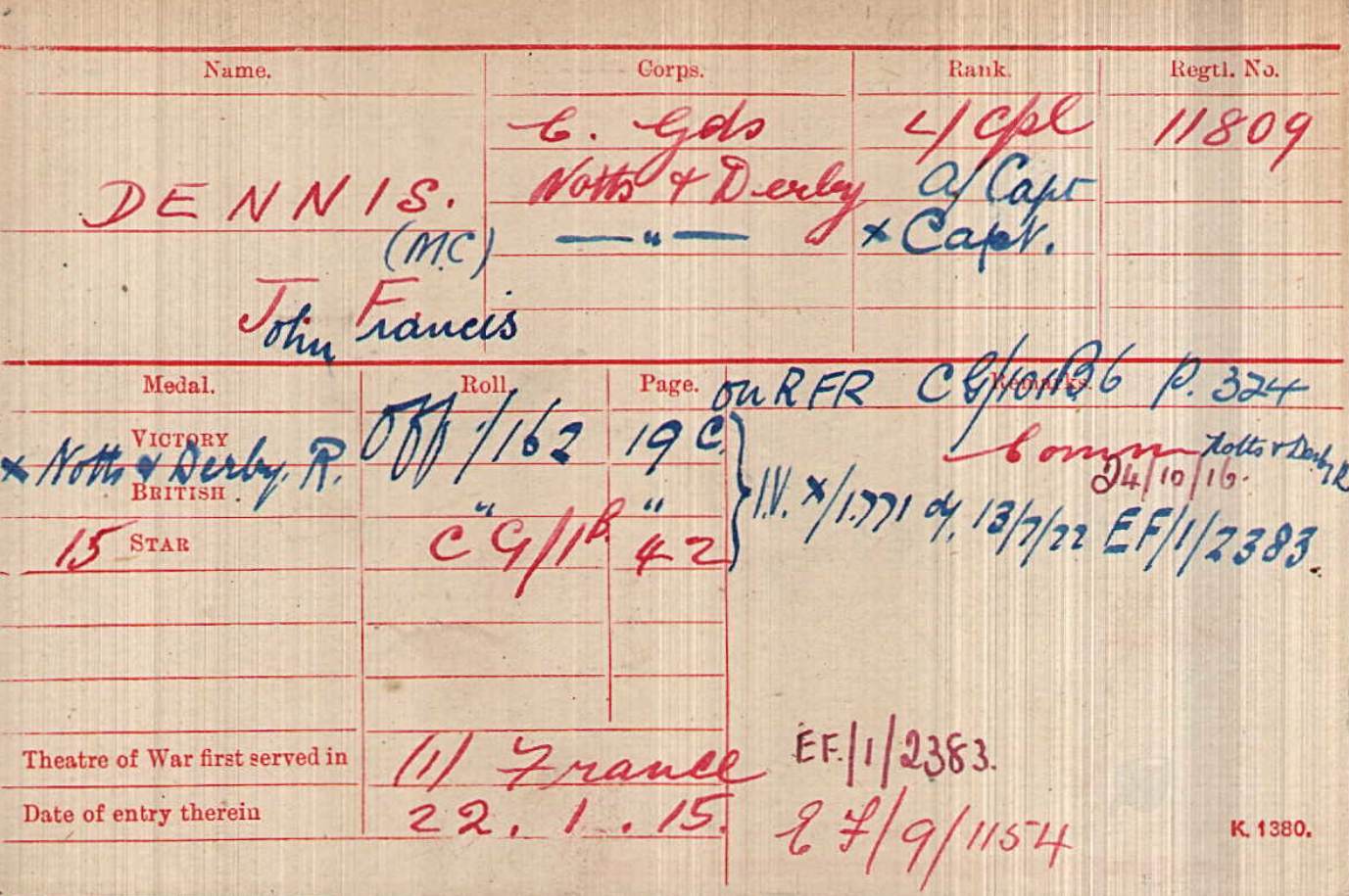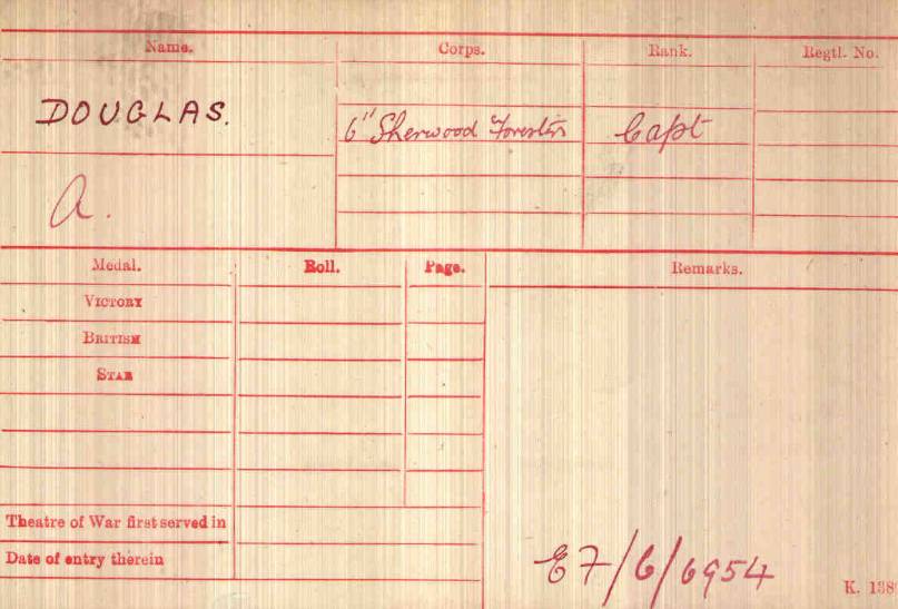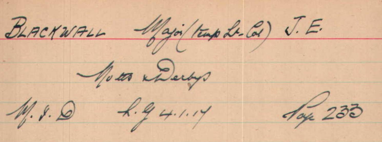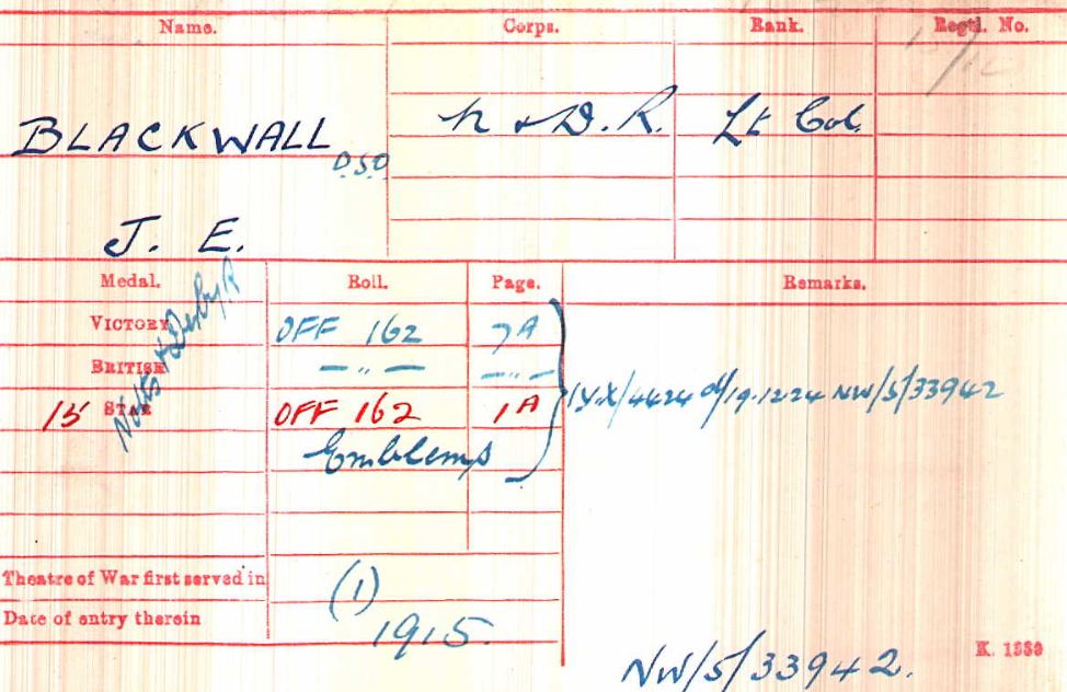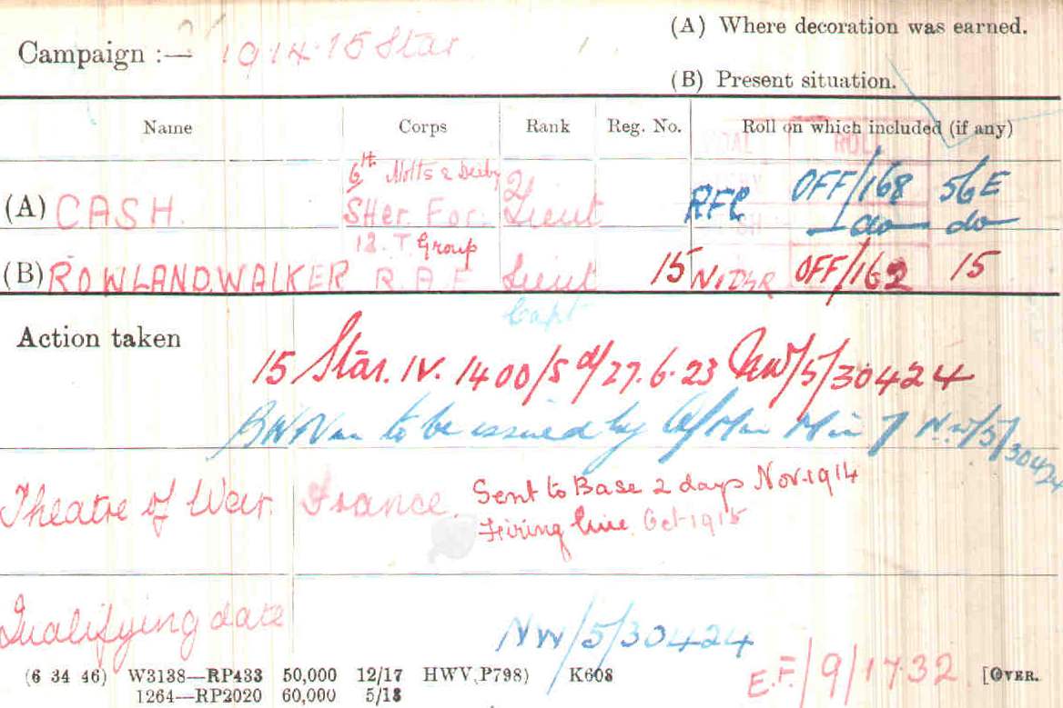 At Braintree in Feb 1915. Arrived in France in February 1915 Took over Command of 8th Sherwood Foresters at Loos on 15th October 1915. Transferred to 8th Sherwood Foresters and promoted Temp Lt/Col on 3rd December 1915. LG MID January 1917 LG DSO January 1917.