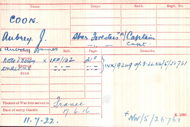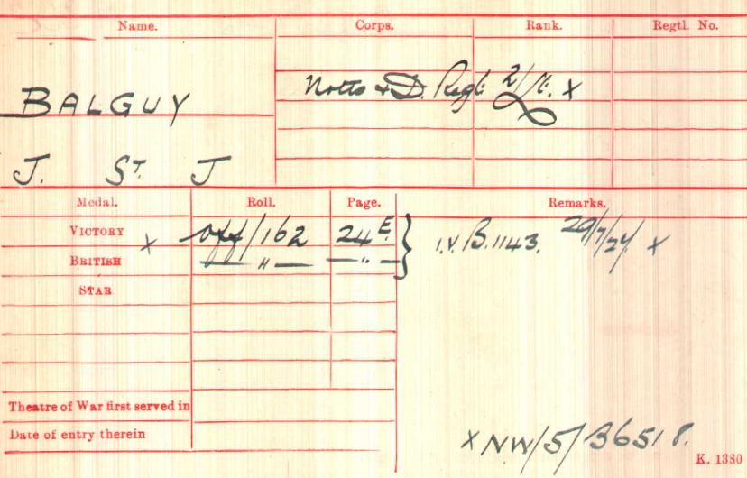 Born 12th June 1887 and died in 1978. Gazetted 2nd Lieutenant on 14th September 1910. Arrived in France in 1915; Joined from England (July 1916); To 3rd Army School (August 1916); Rejoined from Divisional Depot Battn (March 1917); Seconded to 1st Corps School as Instructor (April 1917); Rejoined Battn from 1st Corps (February 1918); On Leave (April 1918).