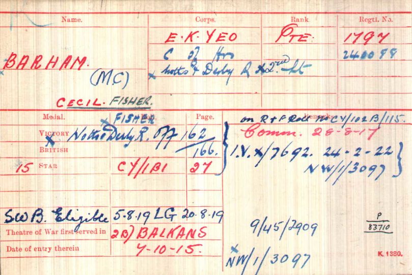 Cecil Fisher Barham. Served with East Kent Yeomanry and Corps of Hussars. Commissioned in August 1917, arrived in France on 26th October 1917 and joined the 6th Battalion on 31st October 1917. Returned to England wounded on 16th April 1918. Awarded the Military Cross.