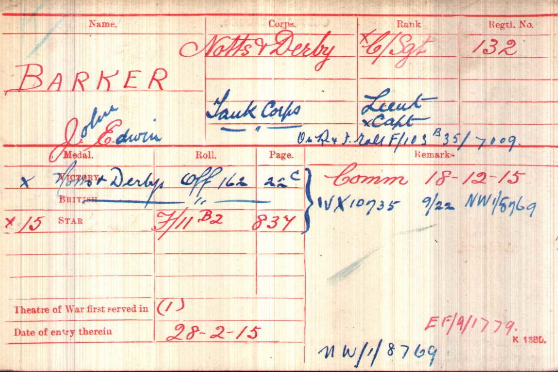 ‘Second-Lieut. J.E. Barker of Clay Cross, who is attached to the Sherwood Foresters has again been wounded in action, his wife receiving official intimation on Monday to the effect that her husband had been admitted into hospital suffering a gun shot wound on the arm. . . . . . Second Lieutenant Barker is a son of Mr and Mrs Barker of Thanes Street, Clay Cross, and his home is in Revil Street, Clay Cross. He was a Sergeant in the local Territorials at the outbreak of hostilities and was later promoted to the rank of Quartermaster Sergeant, and subsequently received a Commission.’