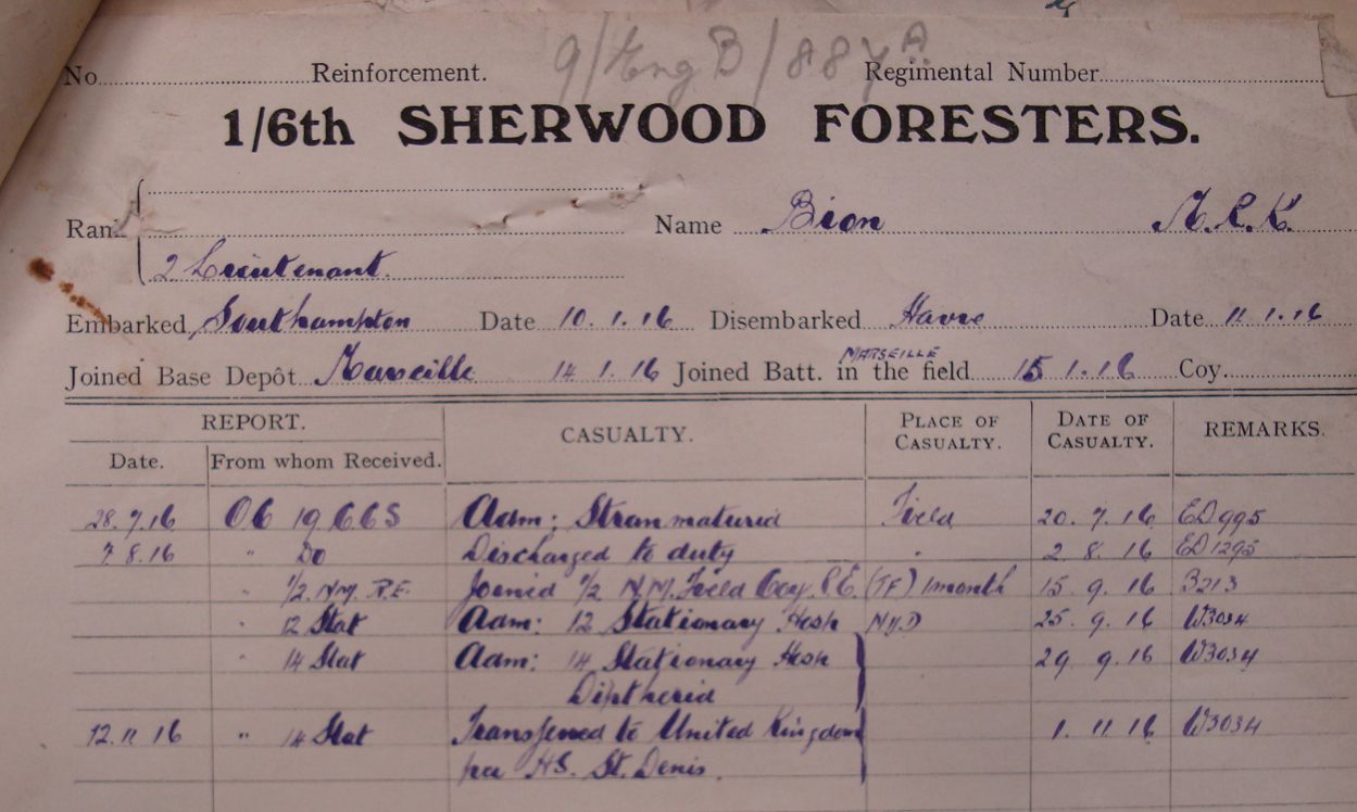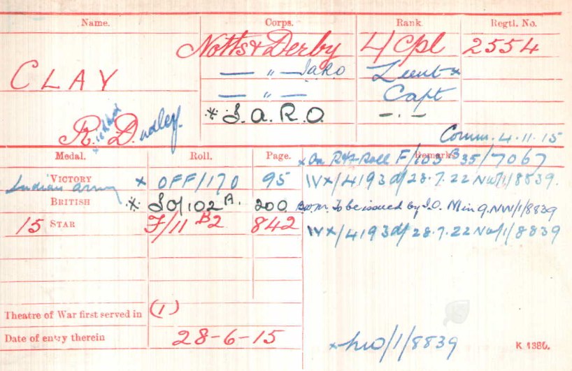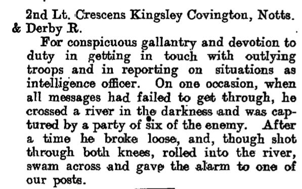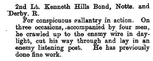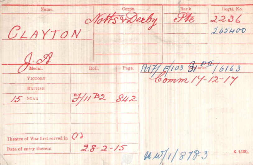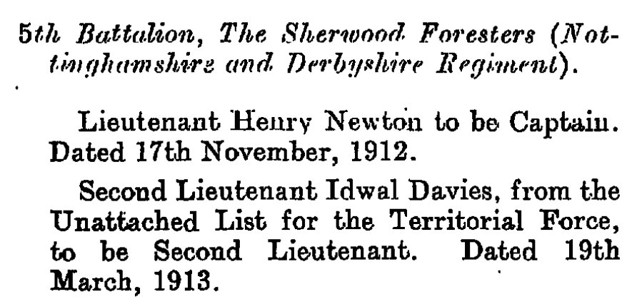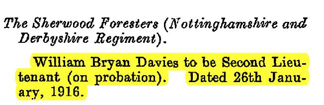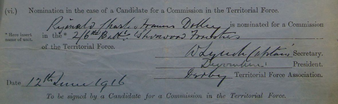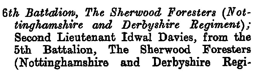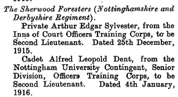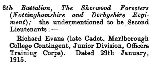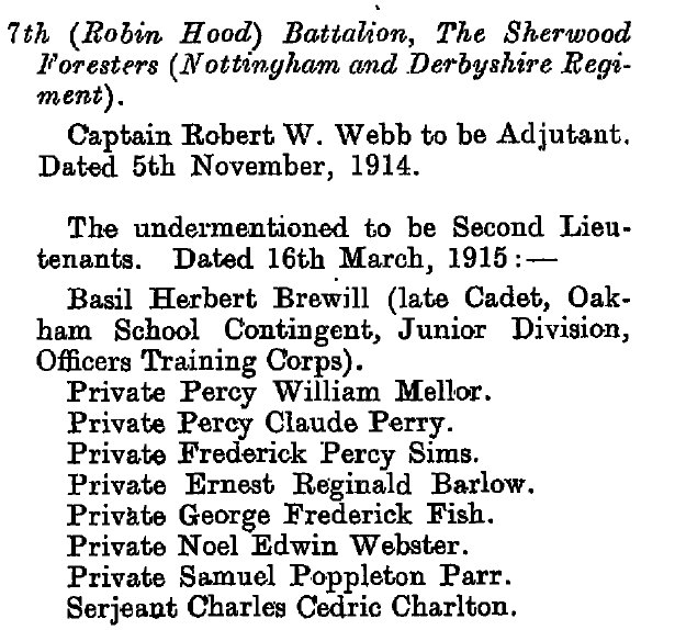 - Recommended for a Commission by his Colonel for good work in the field and was gazetted 2nd Lieut. 1/6th Battalion The Sherwood Foresters in March 1915.