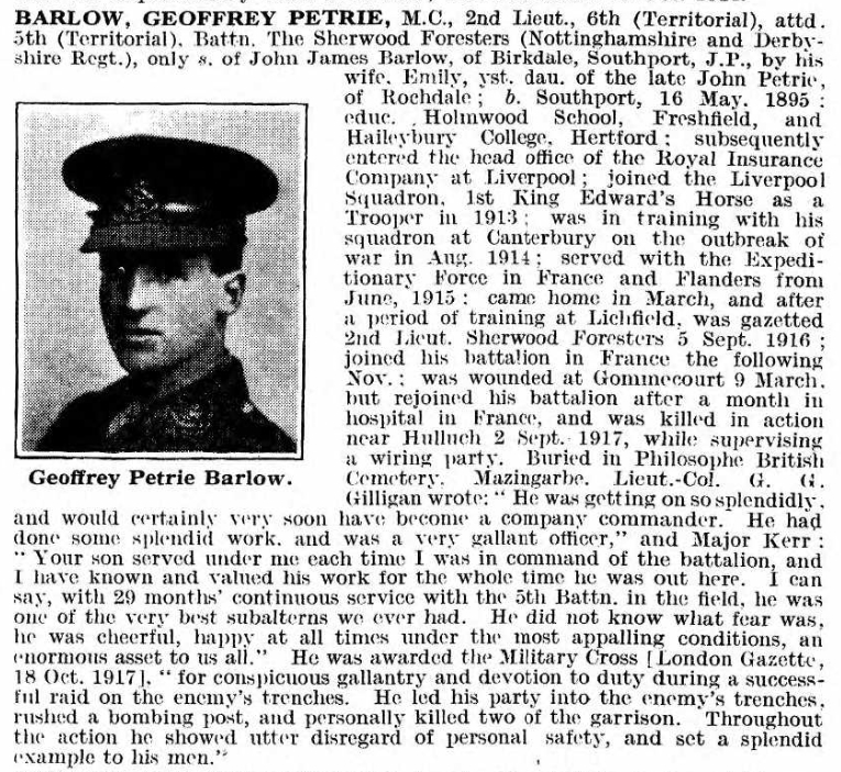 Served with the King Edward’s Horse and arrived in France in June 1916. Commissioned in September 1916 and joined the . Died on the 2nd September 1917. Posthumously awarded the Military Cross for conspicuous gallantry and devotion to duty during a successful raid on the enemies trenches. He led his party in the enemy trenches, rushed a bombing post, and personally killed two of the garrison. Throughout the action he showed utter disregard of personal safety, and set a splendid example to his men (LG 7 March 1918 & WO 374/4010).