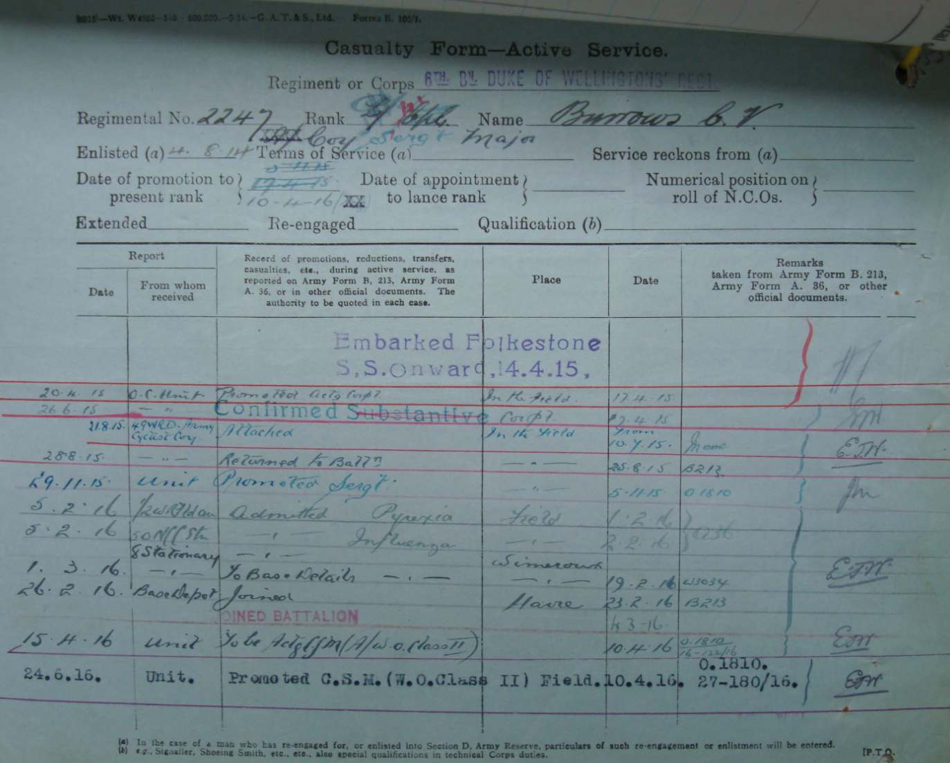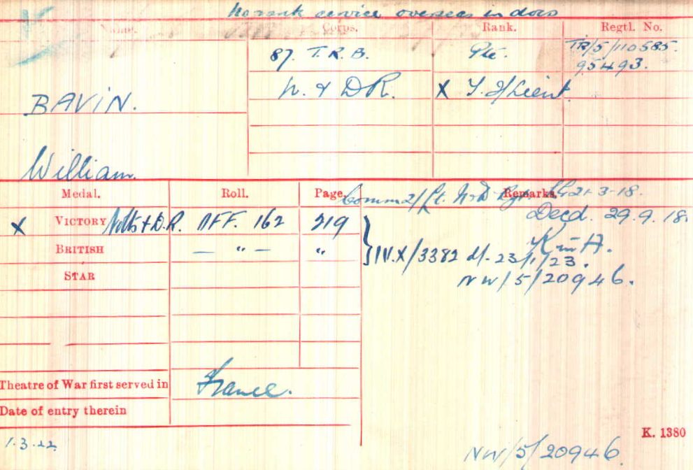 Joined from the 7th Battalion on 27th December 1918 and demobilised on 18th January 1919. Previously served as 216927 Acting Company Sergeant Major in the Manchester Regiment.