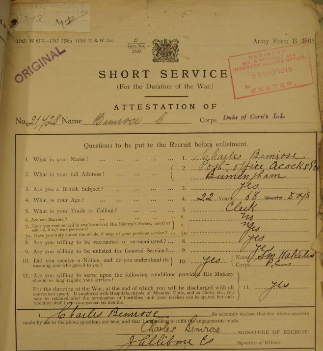 Charles was born on 11th March 1893 the son of Daniel Bimrose, a sub-postmaster of 36 Harlech Terrace, Dewsbury Road in Beeston. He was admitted to Cockburn School on 11th September 1905, just over a year after his elder brother Edgar Alan Bimrose (Private 63441 York & Lancs Regiment).