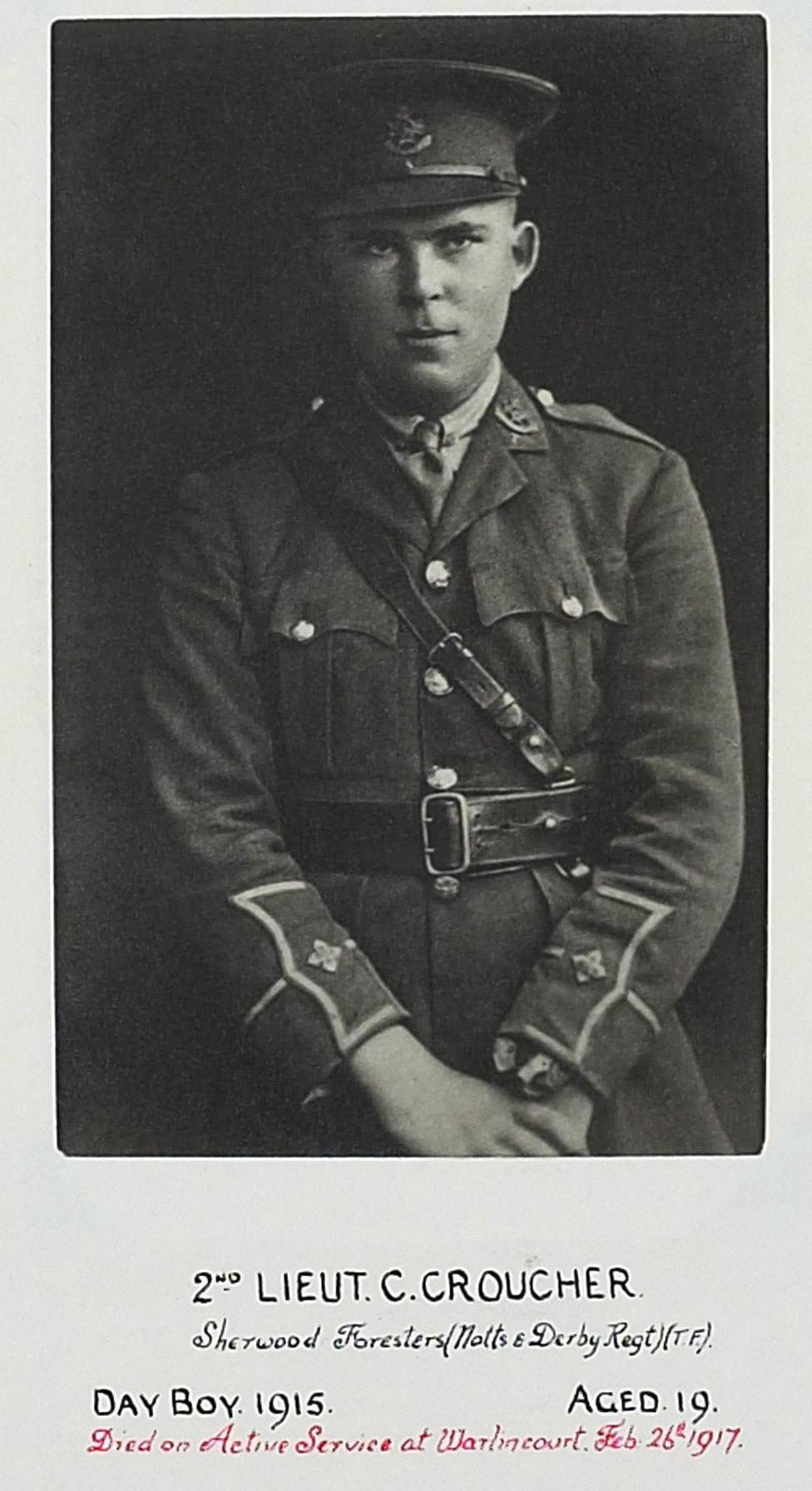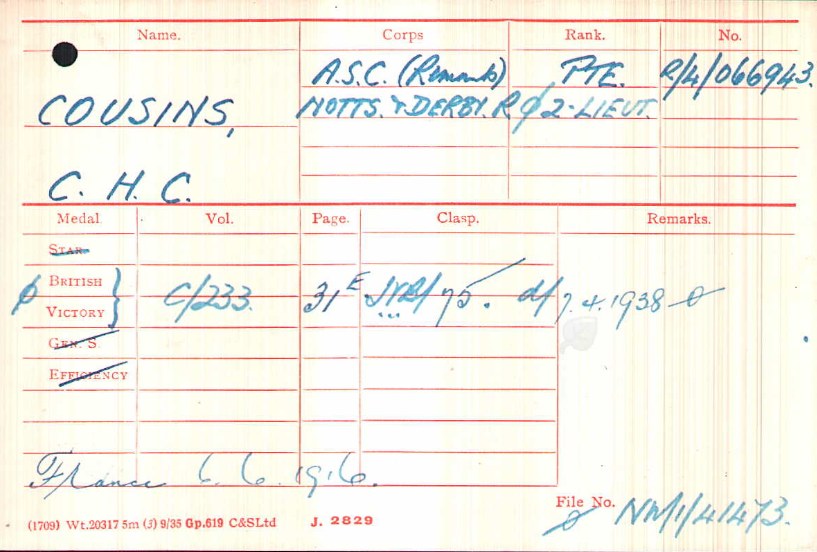Cadet Harold Coop joined the 6th Battalion Notts & Derby Regiment as a 2nd Lieutenant on 19 December 1916 (London Gazette 29 December 1916). Joined the 2/7th (Robin Hood) Battalion at Templeux on 23 April 1917. Promoted to Lieutenant on 19 June 1918.