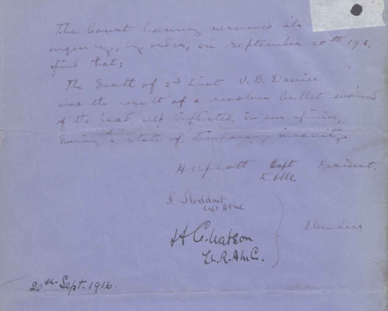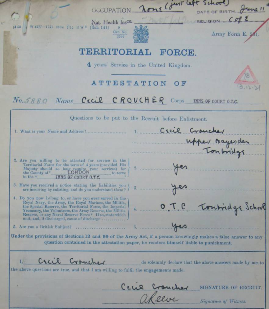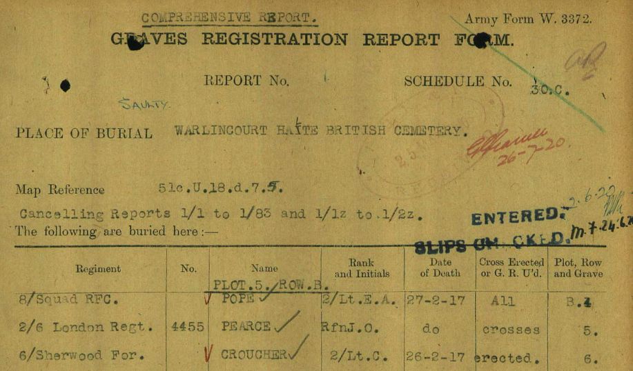 Inns of Court. Served with the 2/6th Battalion Killed in action on the 26th June 1917 and buried in Metz-en-Couture Communal Cemetery Extension by the Field Ambulance. For more information please see here. WO 339/78754.