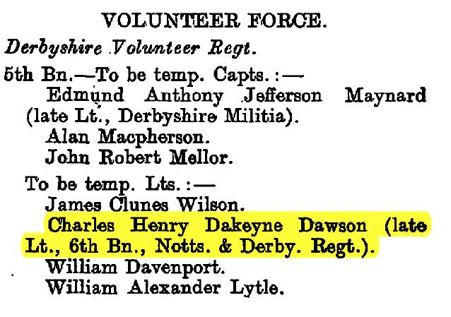 Lieutenant, 2nd Derbyshire Volunteers commissioned 28 May 1884